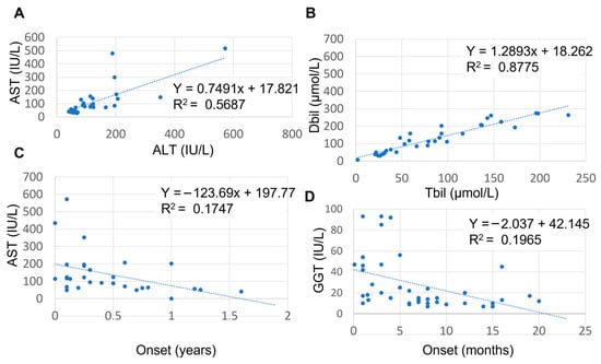 Relationship between AST and ALT, AST/ALT ratio and age, and between GGT and age. (A) Positive relationship between AST and ALT; (B) negative correlation between DBil and TBil; (C) negative relationship between AST and age of onset. (D) negative correlation between GGT and age of onset. AST: aspartate aminotransferase; ALT: alanine aminotransferase; GGT: gamma glutamyltransferase.