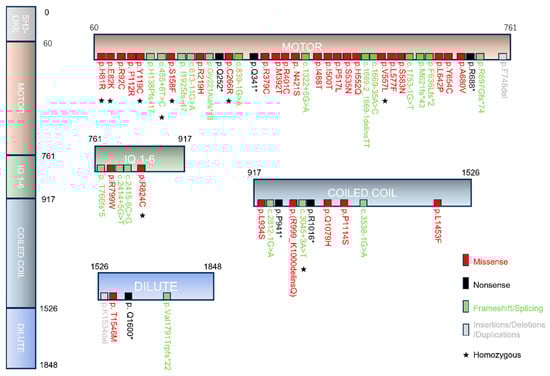 Schematic representation of myosin-Vb variants in MYO5B-associated cholestasis. Scheme showing the myosin-Vb protein, its domains, and the location of known homozygous (indicated by asterisks), heterozygous and compound heterozygous mutations (missense in red, nonsense in black, insertions/deletions/duplications in gray and frameshift/splicing variants in green text color). Protein data are deduced from GenBank RefSeq-file accession number NG_012925.1 for the human MYO5B gene. Nucleotide numbering reflects cDNA numbering with +1 corresponding to the A of the ATG translation initiation codon in the reference sequence. The initiation codon is codon 1.
