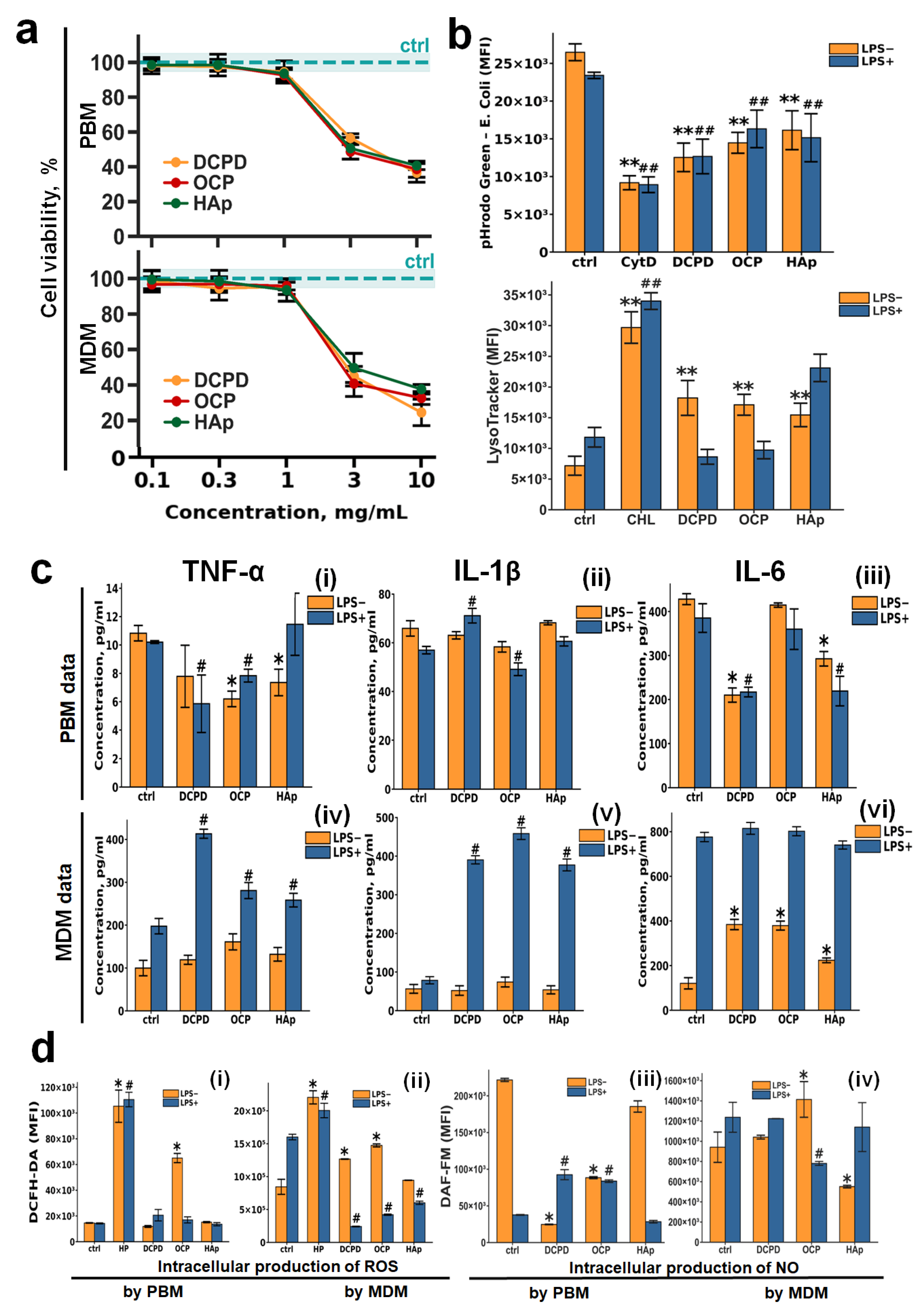 - Minaychev, V.V.; Smirnova, P.V.; Kobyakova, M.I.; Teterina, A.Y.; Smirnov, I.V.; Skirda, V.D.; Alexandrov, A.S.; Gafurov, M.R.; Shlykov, M.A.; Pyatina, K.V.; et al. Low-Temperature Calcium Phosphate Ceramics Can Modulate Monocytes and Macrophages Inflammatory Response In Vitro. Biomedicines 2024, 12, 263. [Google Scholar] [CrossRef]