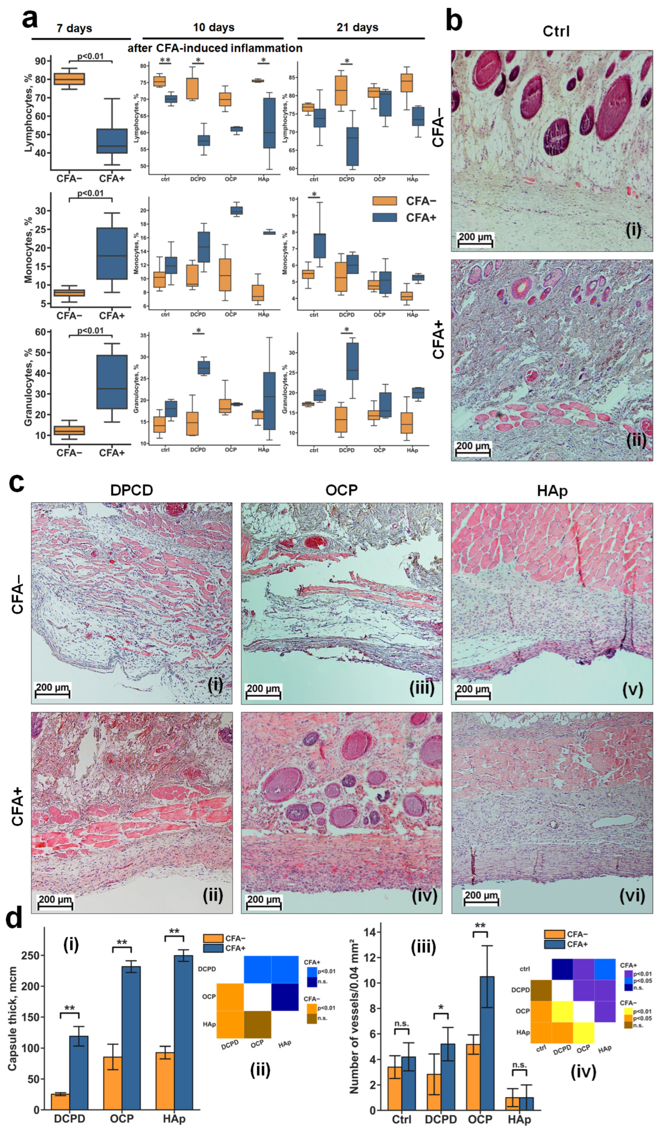 | 8 | 100 µL CFA/0.5 mg/mL | CFA+ HAp | 1st day—CFA injection (0.5 mg/kg); 7 days of expectation; hematological analysis on the 7th day; subcutaneous implantation of a HAp sample (400 mg); hematological analysis on day 17; hematological analysis and humane euthanasia on day 28 of the experiment; histological analysis. | 5 (78–82) |