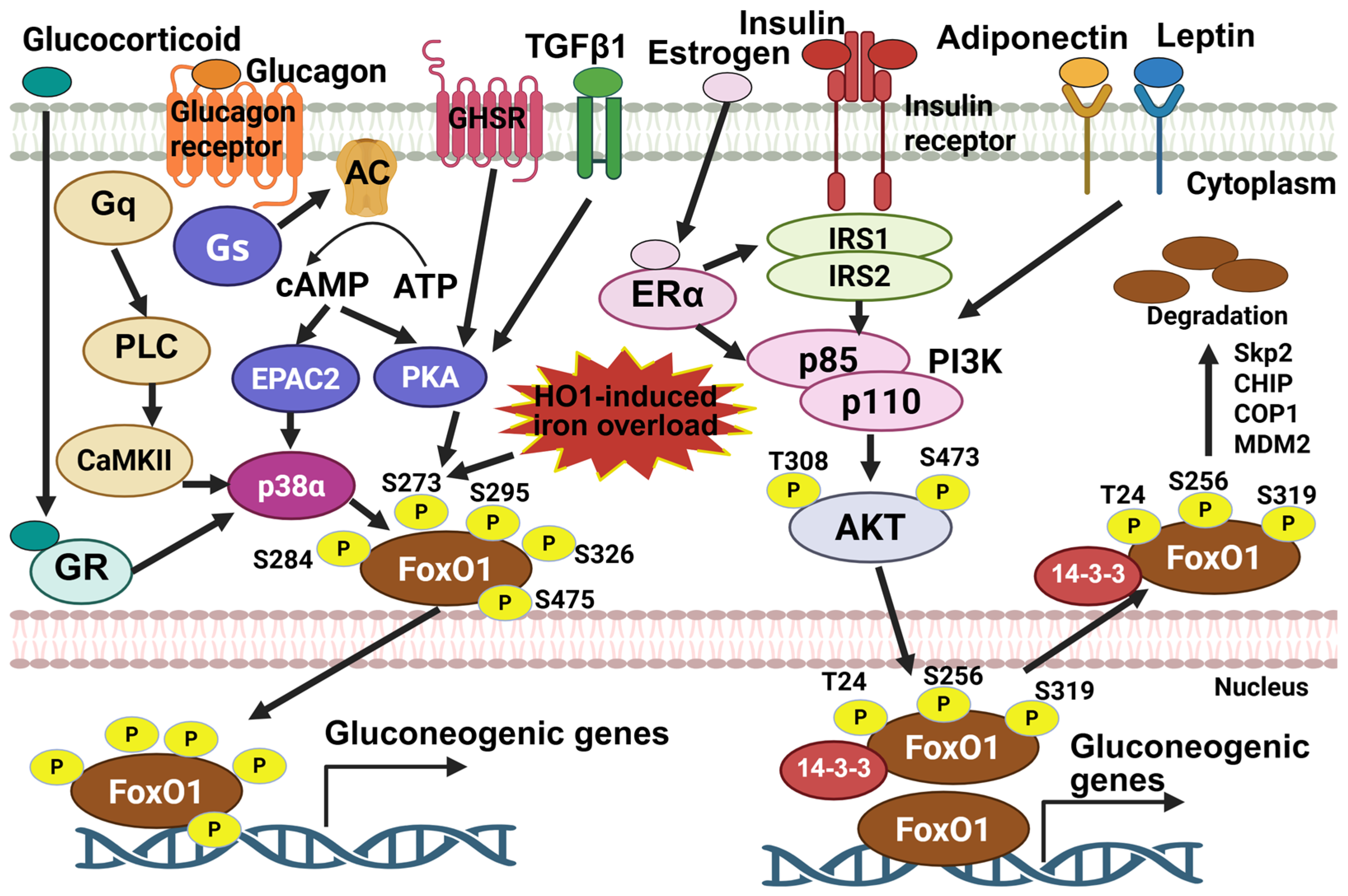 - Liao, W.; Yang, W.; Shen, Z.; Ai, W.; Pan, Q.; Sun, Y.; Guo, S. Heme Oxygenase-1 Regulates Ferrous Iron and Foxo1 in Control of Hepatic Gluconeogenesis. Diabetes 2021, 70, 696–709. [Google Scholar] [CrossRef]