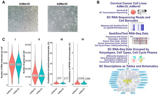(A) Representative images of cervical cancer cell morphology: AdMer35 and AdMer43. (B) Experimental pipeline from obtaining cervical cancer cell lines to single-cell RNA sequencing, cell-type annotation by RNA patterns, and differential gene expression analysis focusing on cellular response to chemoradiotherapy. (C) Violin plots show the distribution of the number of genes per cell (I), the total number of RNA molecules detected per cell (II), the contribution of mitochondrial transcripts (III), and contribution of HPV59 viral transcripts to the cellular transcriptome in both single-cell sequencing arrays (IV). The median values of the distributions shown in insets (I,II) and callouts (III,IV).