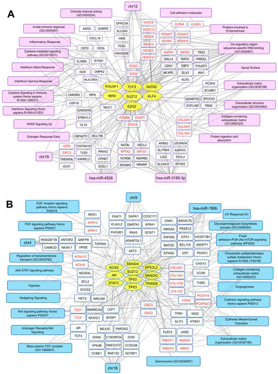 Transcriptional networks up- (A) and downregulated (B) in AdMer43 vs. AdMer35 cells. The network illustrates the relationships between transcription factors (yellow ovals), transcripts (white rectangles), and associated cellular processes or chromosome location (magenta or light blue). The analysis based on transcripts showing elevated (A) or reduced (B) level in AdMer43 vs. AdMer35 cells with Seurat SCTransform, FindMarkers functions (top 300 DEGs with |avg_log2FC| > 1.2, p_val < 1×10−5). Transcripts with similar gene functions grouped and highlighted in red text.