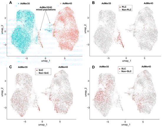 If we compare the data in Figure 3A,B, the highest concentration of PLCs is located in the region of overlapping UMAP coordinates of mixed AdMer35/43 cell populations.