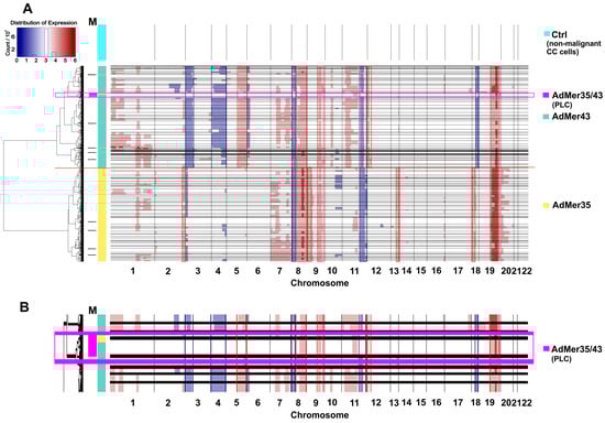 CNV events detected in AdMer35 and AdMer43 cells by InferCNV [27]. (A) Transcriptome data from non-malignant cervical cells were used as a control (Ctrl) [16]. The horizontal black lines separate clusters of cells with similar CNV events arranged in a hierarchical tree on the left. The horizontal red line shows the boundary between the CNV clusters of AdMer35 and AdMer43 cells. Track M shows CNV clusters with mixed cells from both cell lines. A large mixed cluster (n > 100) of AdMer35 and AdMer43 cells with similar CNV events highlighted by a light magenta rectangle and labeled “AdMer35/43” (enlarged in (B)).