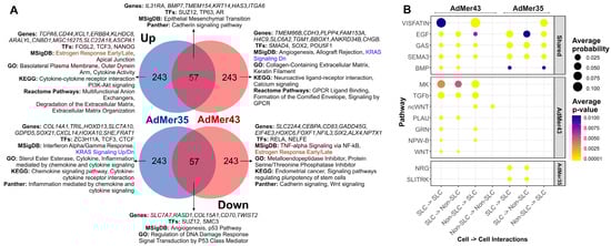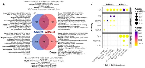 (A) Venn diagrams of top 300 up- or downregulated transcripts in SnCs compared to non-SnCs of the AdMer35 and AdMer43 cell lines. DEGs analysis of SnCs vs. non-SnCs was performed independently for AdMer35 and AdMer43 lines using Seurat FindMarkers with default parameters. Selected results of gene enrichment analysis are represented. (B) A bubble diagram of SnC intra- and intercellular interactions, constructed from CellChat V2 analysis of single-cell transcriptome data from AdMer35 and AdMer43 cell lines. Intercellular interaction classes for general and lineage-specific interactions are shown separately. Presented at the levels of intercellular interactions common (Shared) to both cell lines and specific to a particular line.