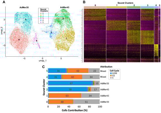 To identify the major cell subpopulations in AdMer35 and AdMer43 lines, we compared their transcriptomes using non-linear dimensionality reduction with uniform manifold approximation and projection (UMAP) (Figure 3A). In the UMAP plot, constructed with the DimPlot Seurat function, transcriptomes of AdMer35 and AdMer43 cells were found to be clearly separated into two large groups representing the majority of cells in these lines. With that, mixed subpopulations of AdMer35/43 cells were identified that had similar characteristics of transcriptomes for both AdMer35 and AdMer43 in terms of UMAP coordinates (Figure 3A).
