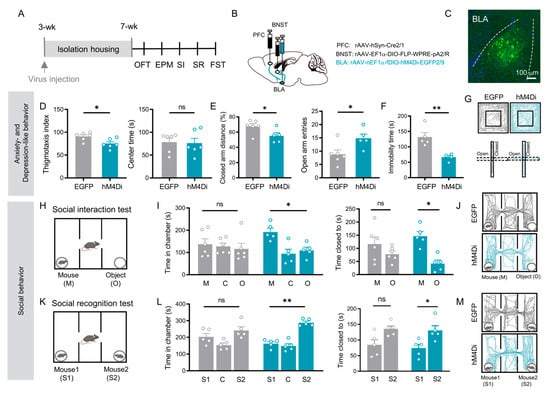 These results demonstrate that chemogenetic inhibition of the specific BLA relay neurons within the PFC → BLA → BNST pathway is sufficient to broadly improve the anxiety-depressive-like and social deficits induced by social isolation.