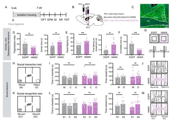 Chemogenetic inhibition of BNST neurons receiving indirect PFC inputs relayed through the BLA alleviate social isolation-induced anxiety-like and depression-like behaviors, but not deficits in social motivation or recognition. (A) Experimental timeline. (B) Schematic of viral injections: rAAV 2/1-Cre into PFC; CAG-DIO-WGA-FLP into BLA; and nEf1α-fDIO-hM4Di (inhibition) or EGFP (control) into BNST. (C) Representative image of labeled BNST neurons in the PFC → BLA → BNST circuit. Scale bar: 100 µm. (D) Open field test: hM4Di group (n = 7) showed reduced thigmotaxis (p = 0.029, Welch’s t test) and increased center time (p = 0.016, Student’s t test) versus EGFP controls (n = 6). (E) Elevated plus maze: hM4Di group (n = 8) increased head-dipping (p = 0.035) and closed-arm latency (p = 0.019) versus EGFP (n = 7). (F) Forced swim test: hM4Di group (n = 6) showed reduced immobility (p = 0.003) versus EGFP (n = 7). ((E,F), Student’s t test) (G) Representative OFT/EPM trajectories. (H–M) Social behavior tests: no significant differences were observed between groups in social interaction (I,J) or social recognition (L,M) (Figure (I,L), all p > 0.05, paired t test). All data: mean ± SEM; * p < 0.05, ** p < 0.01; ns = not significant.