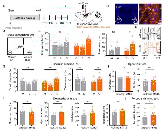 We targeted BNST neurons receiving direct input from the PFC (PFC injection site shown in Figure S2A) by injecting a rAAV 2/1-Cre into the PFC and a Cre-dependent hM4Di AAV into the BNST. Chemogenetic inhibition of these direct pathway neurons in socially isolated mice selectively improved social recognition memory. Treated mice showed a significant preference for a novel mouse over a familiar one (time spent closed to novel mice vs. closed to familiar mice: mCherry: p = 0.119; hM4Di: p = 0.011, Figure 5E left), spending more time in the novel mouse’s chamber than in the familiar mouse’s chamber (mCherry: p = 0.142; hM4Di: p = 0.02; Figure 5E right). Viral expression and histological verification of injection sites for all mice in this experiment are provided in the Supplementary Materials (Figure S2B).
