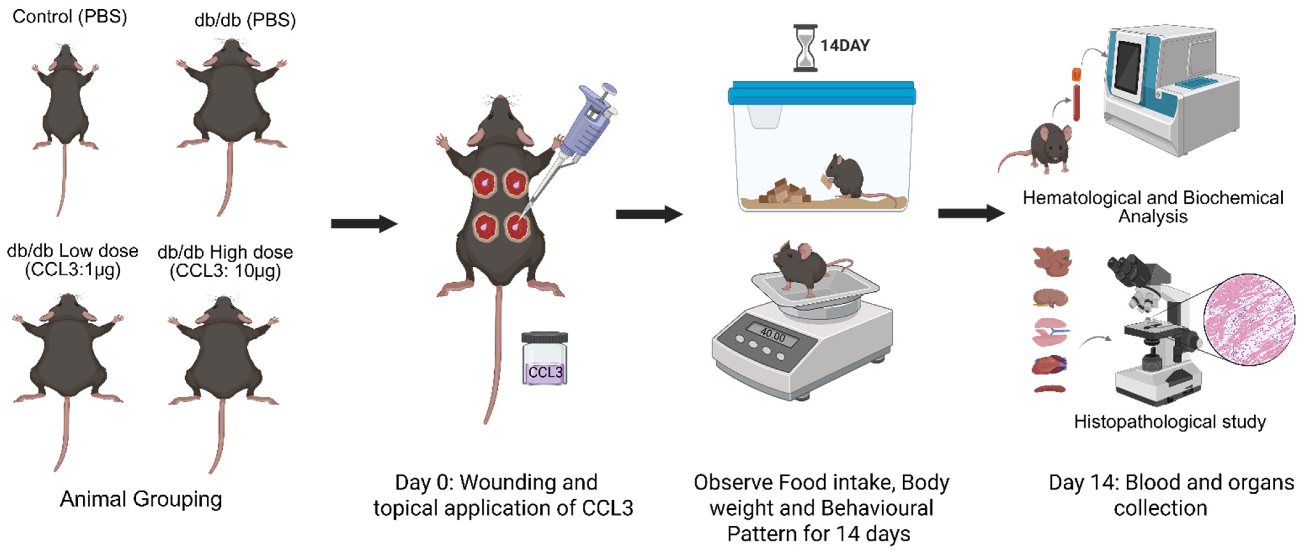 Dehari, D.; Padmakumari, R.; Tesfaw, G.; Fierro, F.A.; Ameer, G.A.; Shafikhani, S.H. Topical CCL3 Is Well-Tolerated and Improves Liver Function in Diabetic Mice: Evidence from a 14-Day Toxicity Study. Cells 2026, 15, 120. https://doi.org/10.3390/cells15020120