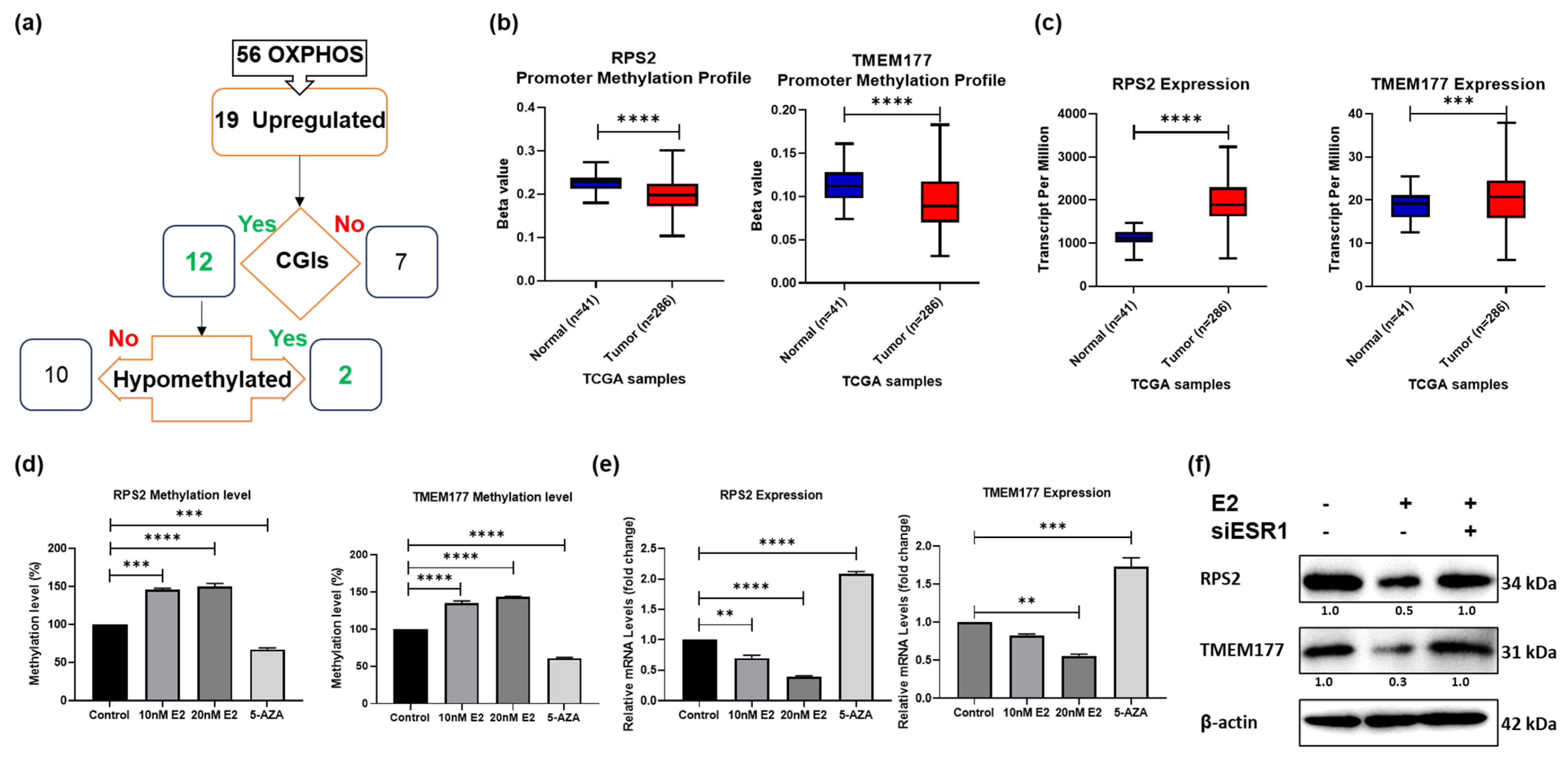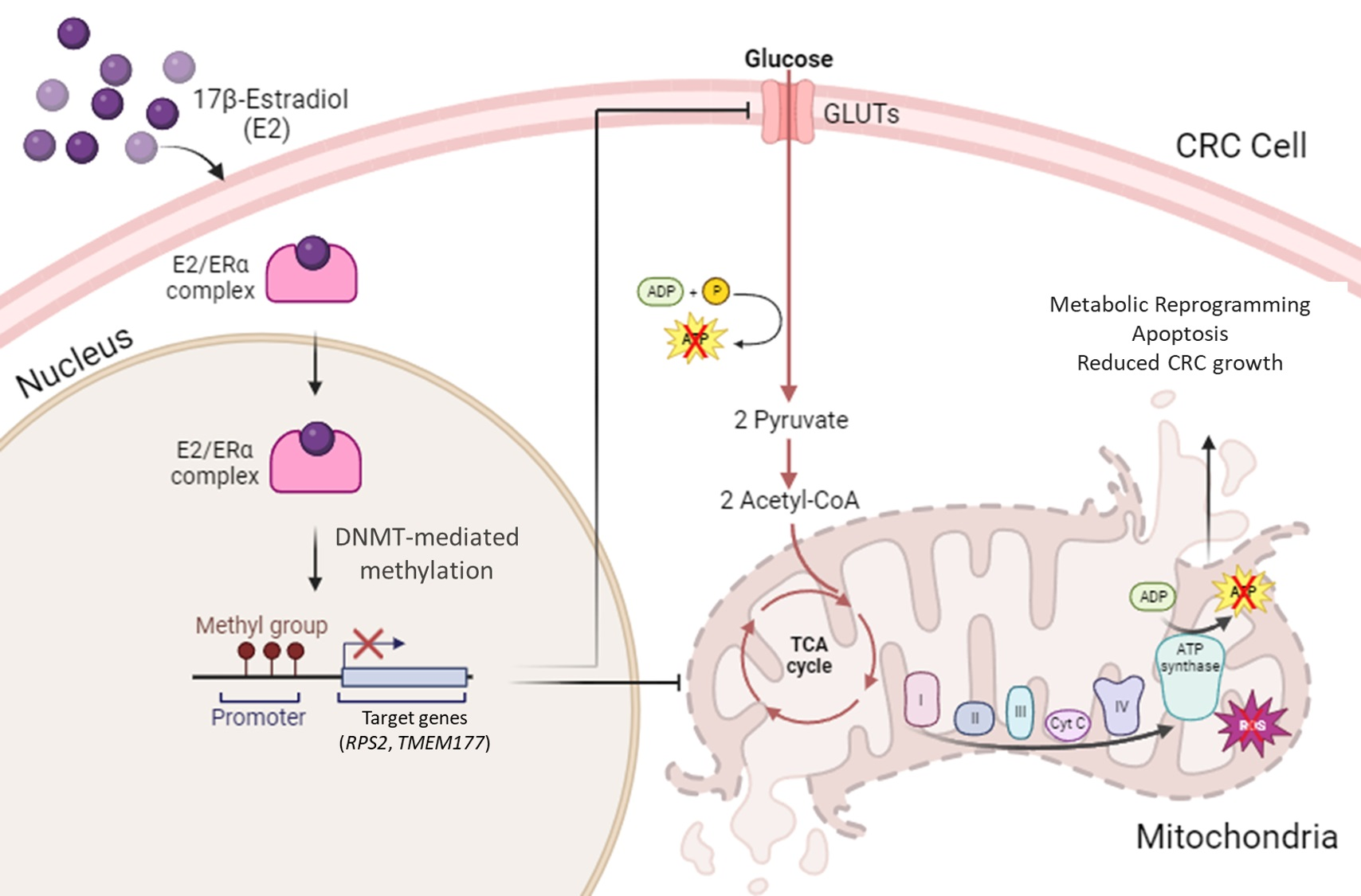 TMEM177, in CRC. Although bisulfite sequencing offers base-resolution methylation analysis, qMSP reliably quantifies promoter methylation changes and is sufficient when the objective is to link methylation with functional outcome. Combined ERα dependence, Aza-mediated reversal, and transcriptional changes provide strong convergent evidence of promoter-level epigenetic regulation. While ChIP could confirm direct ERα recruitment, the observed ERα dependence of methylation changes and transcriptional repression is consistent with an ERα-linked mechanism (direct or indirect) without necessitating ChIP validation at this stage. We did not perform ERα ChIP-qPCR in this study; therefore, direct ERα occupancy at the RPS2/TMEM177 promoter regions remains hypothetical, and we interpret the methylation changes as ERα-dependent but potentially indirect. Our study prioritizes functional causality over molecular cataloging, demonstrating that ERα activation precedes promoter hypermethylation, transcriptional repression, and metabolic collapse—criteria sufficient to establish ERα-dependent epigenetic regulation.
