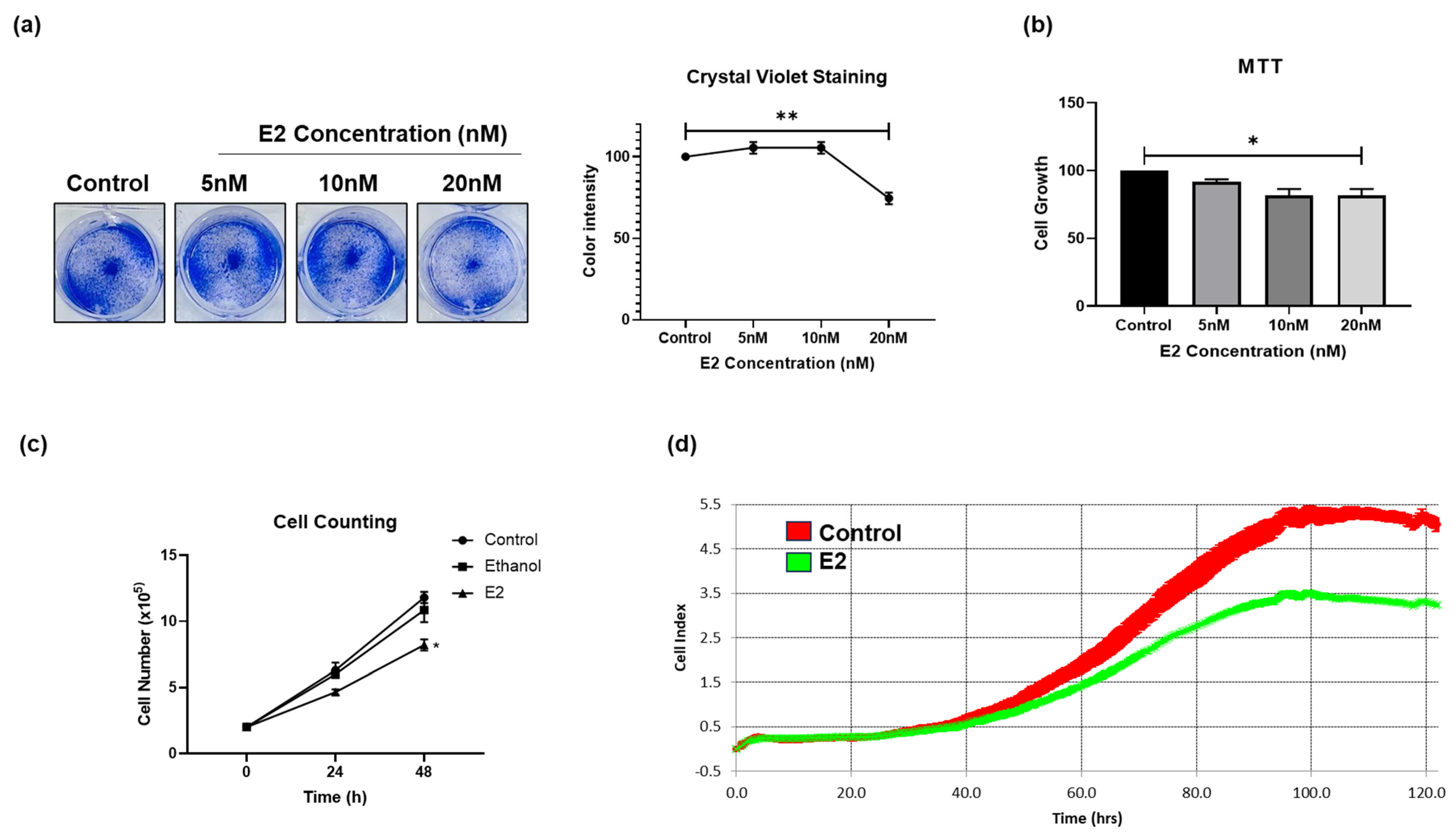 Two CRC cell lines—HCT116 and SW480—were employed in this study. Examining E2 effects in both cell lines, which represent early- and late-stage adenocarcinoma, is critical for understanding the diverse roles of E2 in CRC progression. Early-stage SW480 cells allow assessment of E2 effects on tumor initiation and early growth, whereas late-stage HCT116 cells provide insight into advanced tumor behaviors such as resistance to apoptosis. Studying these distinct stages improves understanding of potential stage-specific therapeutic implications of E2 in CRC [