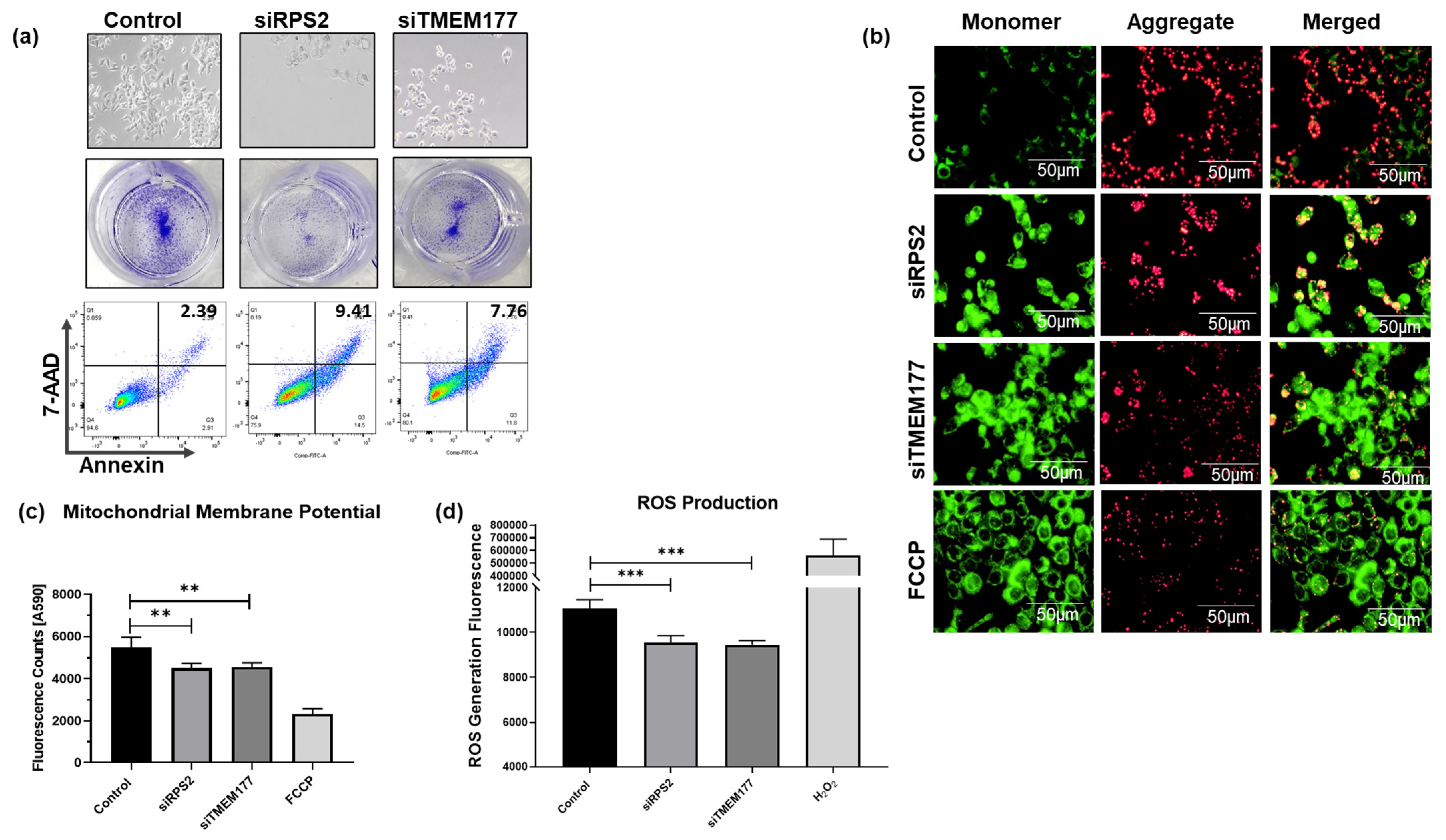 16]. Although additional metabolic flux assays could add granularity, the concordant findings of mitochondrial depolarization, reduced OCR/ATP output, and apoptosis sufficiently support impaired OXPHOS in this setting. While our data supports the role of RPS2 and TMEM177 in maintaining mitochondrial integrity and OXPHOS output, the precise molecular mechanisms were not dissected. Importantly, loss of MMP represents a proximate functional marker of impaired electron transport coupling, supporting the proposed axis at a systems level. Recent studies have further demonstrated that E2 influences the expression of key proteins involved in mitochondrial function. Specifically, E2 inhibits the activity of mitochondrial complexes I, II, III, and IV, all of which are essential for ATP production via OXPHOS [