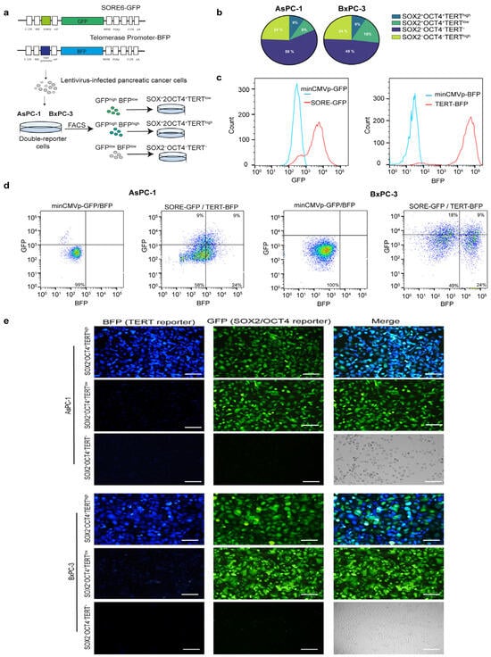 Next, we investigated whether TERT is expressed in pancreatic CSCs and the functional contribution of TERT-expressing tumor cells and TERT-negative cells. To identify a telomerase-positive cancer stem-like subpopulation within pancreatic cancer cell lines, we established a dual lentiviral reporter strategy to simultaneously monitor SOX2/OCT4 and TERT activity. For telomerase, we engineered a lentiviral reporter construct in which the human TERT promoter was coupled to a minimal promoter driving BFP expression, enabling the identification of TERT cells. To label pancreatic CSCs SOX2+OCT+, we employed the SORE6 reporter, a previously validated system that identifies the CSCs population [20]. The SORE6 reporter contains six tandem repeats of a composite SOX2/OCT4 response element driving GFP expression. Thus, cells co-expressing SOX2/OCT4 and TERT could be visualized through dual GFP and BFP positivity (Figure 2a). To generate double-reporter cell lines, human AsPC-1 and BxPC-3 pancreatic tumor cells were genetically modified by transduction with lentiviral TERT-BFP and SORE6-GFP vectors for stable expression (Figure 2a). Validation of both reporters is shown in Appendix A: minimal promoter constructs yielded no detectable signals, whereas CMV controls were robustly fluorescent (Figure A1 Appendix A). Flow cytometry analyses revealed that dual GFP and BFP positivity (GFP+BFPhigh) defined a SOX2+OCT4+TERThigh minority population, representing approximately 9% of cultured cells in both AsPC-1 and BxPC-3 cells. A comparable frequency of GFP+BFPlow (SOX2+OCT4+TERTlow) cells, ranging from 9–18% depending on the cell line, was detected, indicating that reporter activation was restricted to a subset of tumor cells. Importantly, approximately 50% of the cells were telomerase-positive but negative for the stemness reporter (GFP−BFP+). Cells transduced with minimal promoter constructs lacking either the SORE6 element or TERT promoter served as gating controls and did not exhibit reporter activity (Figure 2b–d). Fluorescence microscopy further validated the reporter activity in the sorted subpopulations. SOX2+OCT4+TERThigh cells exhibited robust dual GFP and BFP fluorescence, whereas SOX2+OCT4+TERTlow and SOX2−OCT4−TERT− fractions showed correspondingly reduced or absent reporter expression (Figure 2e). Collectively, our data revealed an SOX2+OCT4+TERThigh subpopulation in AsPC-1 and BxPC-3 cell lines.