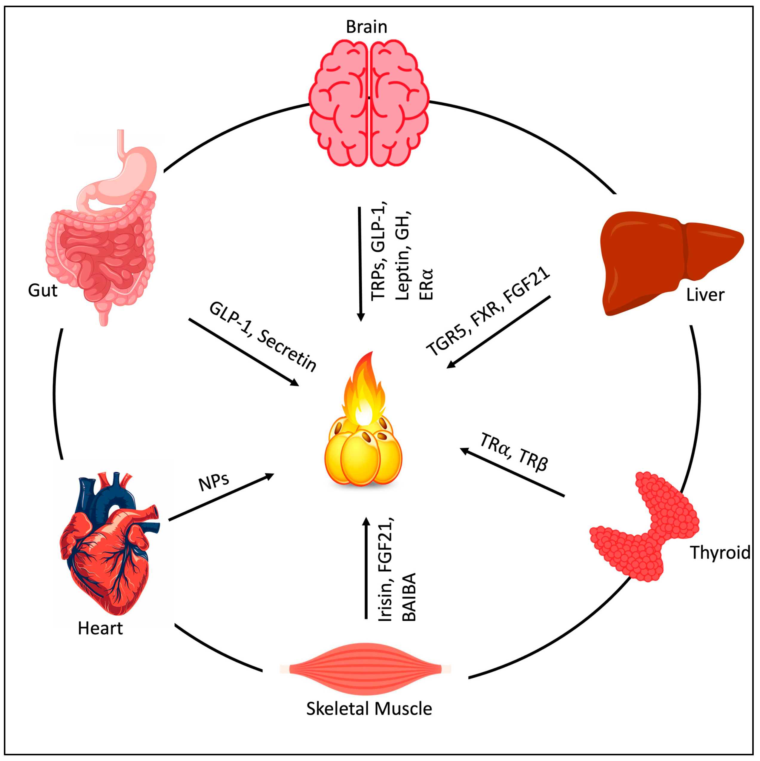 | TRα/TRβ | Brain, heart, AT, skeletal muscle | T4 ⟶ T3 (DIO2)-β3/SRT1 | Rodent, Human | UCP1-dependent | Permissive and Direct | [145] |