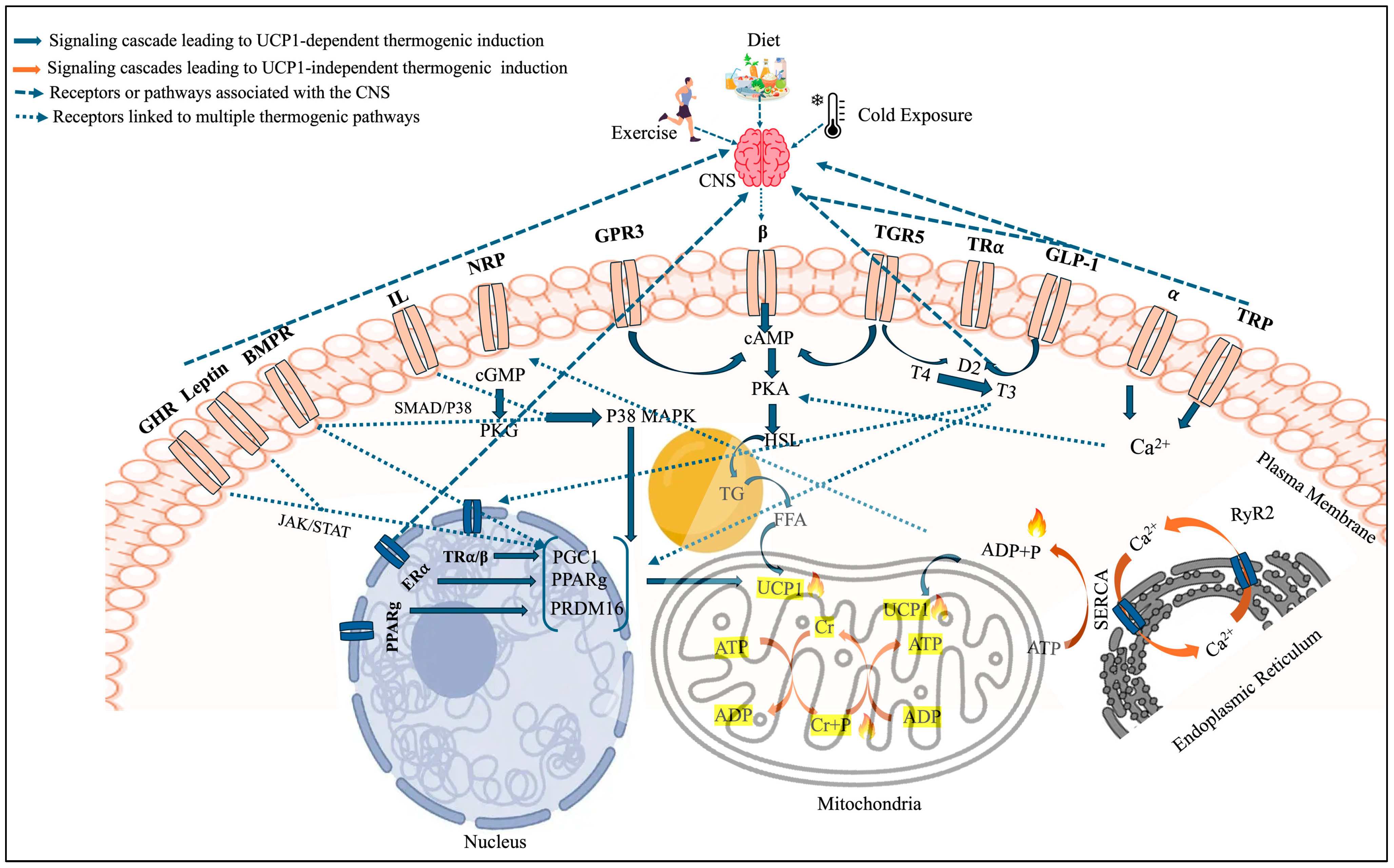 | Receptor/Pathway | Primary Location(s)/Action | Core Mechanism | Evidence Base | UCP1 Dependence | Thermogenic Role | Refs. |
