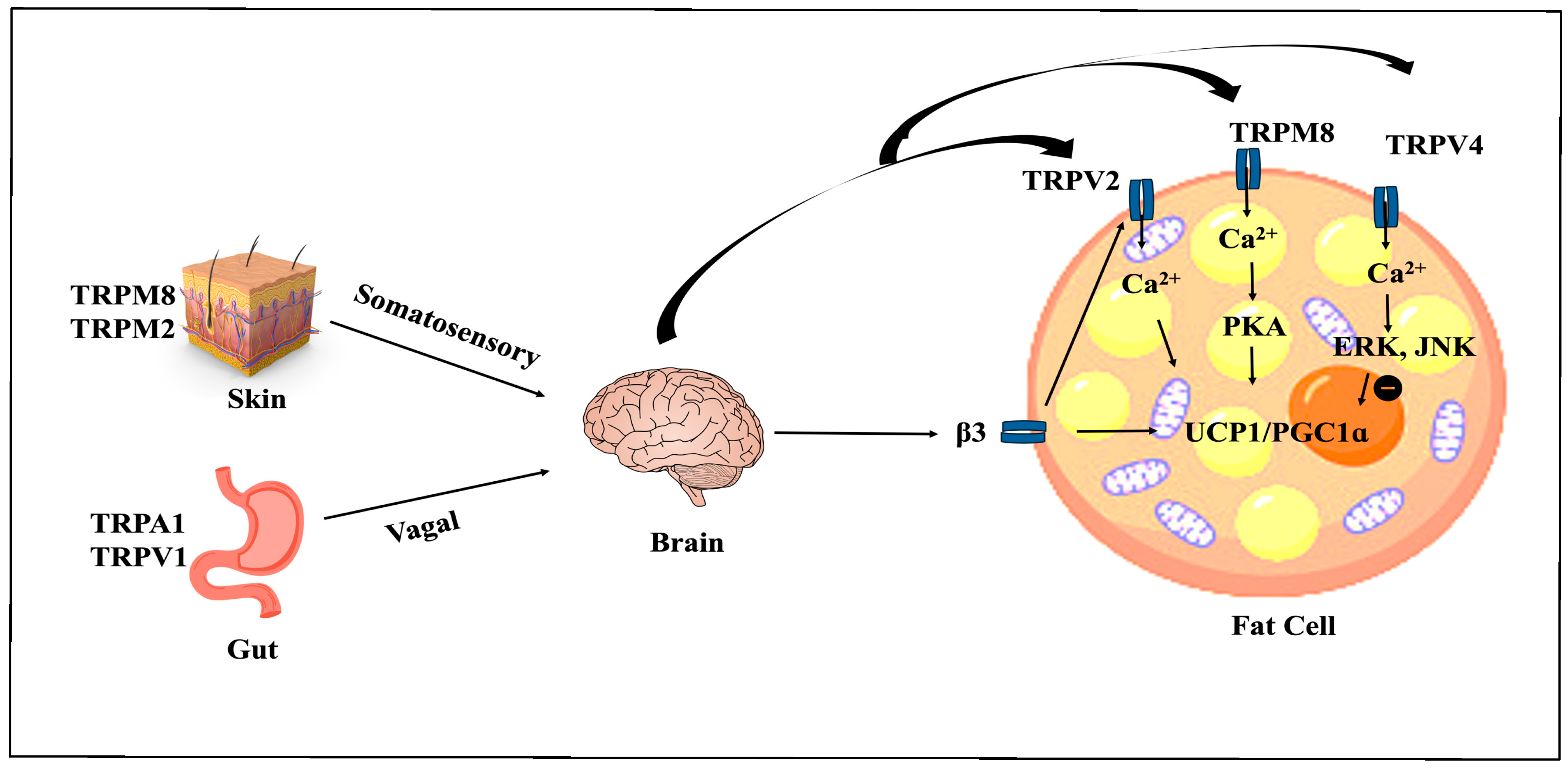 | TRPV1 | Gut, skin, AT | Ca2+–AMPK–SIRT1-UCP1 | Rodent, Human | UCP1-dependent | Permissive | [55] |