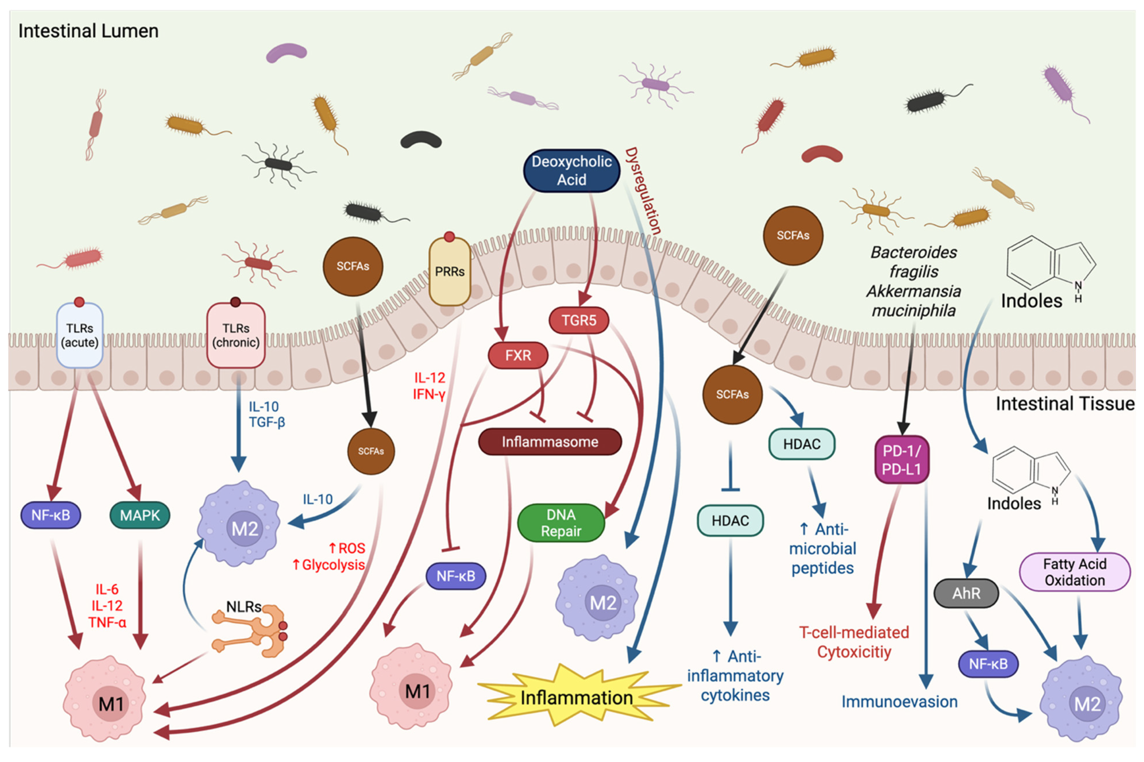 Furthermore, the microbiota exerts indirect effects on macrophage activity by modulating systemic immune tone and reshaping the cytokine environment within tumors. For example, some species have been shown to promote TGF-β or IL-10 production, which would support M2 polarization, while others stimulate IFN-γ and IL-12 production, favoring the M1 pathway. Additionally, microbial signals have been shown to induce remodeling of macrophages by altering histone acetylation and DNA methylation, leading to long-term changes in gene expression [