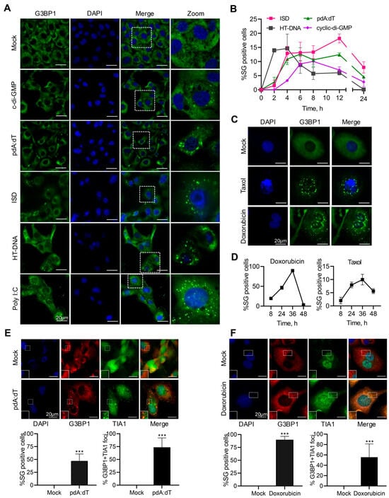To determine if the anomalous presence of dsDNA in the cytoplasm induces stress granule formation, human fibrosarcoma cells, HT1080, were transfected with the following different types of immunostimulatory dsDNA ligands: (a) ISD (interferon stimulatory DNA), containing bacterial DNA motifs, (b) poly (pdA:dT, synthetic dsDNA), (c) HT-DNA (herring testis DNA), and (d) cDG (c-di-GMP, cyclic dinucleotide of bacterial origin), and localization of the key stress granule protein, G3BP1, in distinct stress granules was compared to mock-treated cells. For comparison with dsRNA ligands, cells were treated with synthetic dsRNA, polyI:C, previously shown to induce stress granules [46]. DNA ligands induced discrete G3BP1 puncta characteristic of stress granules similar to polyI:C, compared to diffuse G3BP1 distribution in mock-treated cells (Figure 1A). Stress granules (SGs) are phase-separated aggregates that assemble and disassemble in a dynamic way in response to stress stimuli [41,49]. To determine the dynamic nature of assembly/disassembly of SG, we monitored SG formation in real time in HT1080 cells stably expressing GFP-G3BP1 in response to the DNA ligands. The kinetics varied and we observed gradual increase over time in % cells showing SG assembly that declined over the course of recovery from stress (Figure 1B). Exposure of cells to DNA damage agents results in accumulation of cytoplasmic DNA, some in the form of micronuclei, triggering inflammatory response and cytokine production [20,50,51,52,53]. To determine if DNA damage agents induce formation of SG, Doxorubicin- or Taxol-treated HT1080 cells were analyzed for SG formation compared to mock-treated cells and SG formation in real-time was monitored in GFP-G3BP1 expressing cells. Both Doxorubicin and Taxol induced SG; however, compared to Taxol, Doxorubicin induced significantly more SG, and we have focused on Doxorubicin-induced pathways in these studies (Figure 1C,D). To characterize the canonical SG, HT1080 cells were transfected with pdA:dT or HT-DNA and stained for SG markers, G3BP1 and TIA1 and cells forming SG, and % of SG showing co-localization of both G3BP1 and TIA1 was determined by immunostaining and microscopy. We observed 70–80% of SG to show the presence of both G3BP1 and TIA1 as would be expected for canonical SG (Figure 1E). Doxorubicin-treated cells were stained for SG markers, G3BP1, and TIA1 and greater than 80% of SG show co-localization of both G3BP1 and TIA1 typical of SG (Figure 1F).