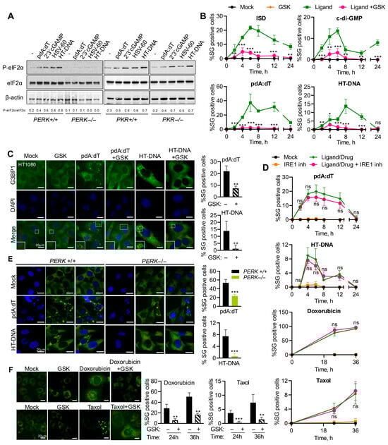 Of the stress kinases, PKR and PERK are activated by dsRNA or ER-stress and phosphorylate an eukaryotic translation initiation factor, eIF2α, to inhibit translation, which nucleates the SG formation [37]. To determine the stress kinase that transmits the dsDNA signals, WT, PERK−/−, and PKR−/− mouse embryonic fibroblasts (MEFs) were transfected with pdA:dT, HT-DNA, HSV-60, a 60 bp viral DNA motif derived from Herpes Simplex Virus-1, or 2′-3′cGAMP (STING activator), and phosphorylation of eIF2α (p-eIF2α) in cell lysates was compared by immunoblotting. MEFs lacking PERK showed no eIF2α phosphorylation in response to any of the DNA ligands compared to WT MEFs, while MEFs lacking PKR showed p-eIF2α like WT cells (Figure 2A). WT, PERK−/−, and PKR−/− MEFs were treated with polyI:C or 2′-3′cGAMP and SG formation was monitored by staining G3BP1 by immunofluorescence microscopy. MEFs lacking PKR were defective in polyI:C-induced SG formation but not with cGAMP, and PERK lacking MEFs was proficient in polyI:C-induced SG but defective in cGAMP-induced SG formation, confirming the specificities of the stress kinases (Figure S1). In HT1080 cells, at all times in the course of SG induction by pdA:dT, cDG, HT-DNA, and ISD ligands, inhibition of PERK activity with inhibitor GSK2656157 (GSK) resulted in significant reduction or complete inhibition of SG formation (Figure 2B). We performed immunofluorescence assays to detect G3BP1 in SG formed by cells pretreated with GSK or mock-treated (Figure 2C). Inhibiting PERK activity with GSK inhibitor significantly reduced G3BP1 puncta in response to both ligands. We observed similar induction of SG in primary NuFF cells (human newborn foreskin fibroblasts) transfected with pdA:dT, which was inhibited by GSK pretreatment, extending the relevance of our observations to primary cells (Figure S2). Cells treated with IRE1 inhibitor showed similar induction of SG by pdA:dT, HT-DNA, Doxorubicin, or Taxol during the time course of treatment (Figure 2D). The requirement of PERK activity for SG induction by transfection of these dsDNA ligands was further confirmed in PERK−/− MEFs compared to WT MEFs (Figure 2E). To test if endogenous dsDNA produced by DNA damage agents also requires PERK activity to induce SG, HT1080 cells stably expressing GFP-G3BP1 were mock-treated or pretreated with GSK inhibitor in cells exposed to Doxorubicin or Taxol. As with the DNA ligands transfected to cells, inducing DNA damage resulted in SG formation, which could be significantly reduced by inhibiting PERK activity (Figure 2F). Taken together, our results show that cytoplasmic presence of dsDNA, introduced ectopically or produced from endogenous sources, can activate stress response pathways, specifically PERK, to phosphorylate eIF2α-promoting SG formation.