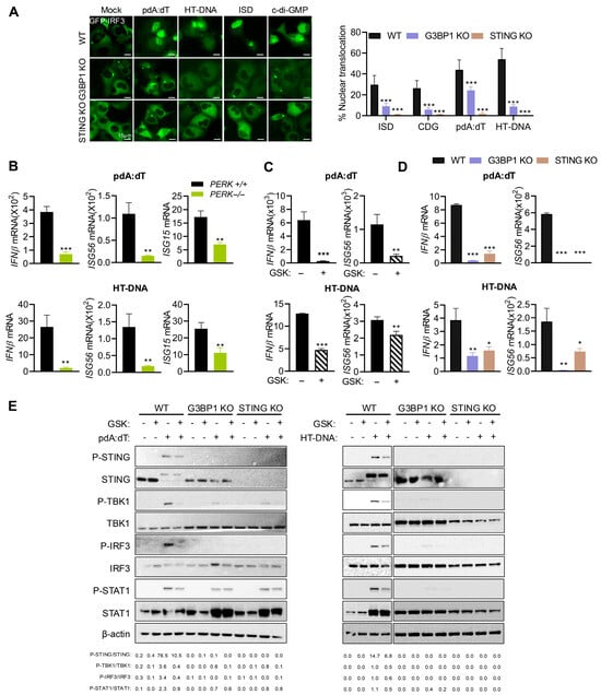 Cytosolic DNA, including endogenous DNA released by DNA damage, is sensed by cGAS to produce cGAMP that binds and activates STING, which translocates from ER to Golgi, resulting in phosphorylation of TBK1 and IRF3. STING also activates NF-κB; both IRF3 and NF-κB subsequently translocate to the nucleus to transcriptionally induce type I IFN and inflammatory cytokines [12]. Our results show an important role of PERK in signaling by dsDNA ligands and SG formation, and our previous studies showed an important role of antiviral stress granules induced by dsRNA as a platform to integrate IFNβ production and signaling [46]. We first determined the involvement of IRF3 in dsDNA ligand-mediated IFNβ signaling in WT, STING KO, and G3BP1 KO cells. The translocation of GFP-IRF3 to the nucleus in cells transfected with pdA:dT, HT-DNA, ISD, or cDG was monitored, and STING KO and G3BP1 KO cells showed 3- to 5-fold decrease in nuclear IRF3 translocation compared to WT cells. Notably, the lack of STING had a greater impact on IRF3 nuclear translocation (Figure 5A). To examine the role of stress response and PERK activity on IRF3-mediated IFNβ signaling and induction of IFN-stimulated genes (ISGs), WT and PERK−/− MEFs were transfected with pdA:dT or HT-DNA, and mRNA levels of IFNβ, ISG56/P56/IFIT1, and ISG15 were compared. In line with reduced IRF3 nuclear translocation, mRNA levels of IFNβ and ISGs were reduced in cells lacking PERK in response to DNA ligands (Figure 5B). Inhibiting PERK activity with inhibitor GSK in HT1080 cells showed a similar decrease in IFNβ and ISG56 mRNA levels, following transfection with pdA:dT or HT-DNA (Figure 5C). To test the importance of STING and G3BP1 as mediators of dsDNA-activated IFN signaling and response, we transfected WT, STING KO, and G3BP1 KO cells with pdA:dT or HT-DNA, compared mRNA levels of IFNβ and ISG56 by RT-PCR, and analyzed cell lysates on immunoblots for activation of innate signaling proteins. As expected, knockout of STING and G3BP1 in HT1080 cells significantly reduced transcriptional induction of IFNβ and consequently ISG56 (Figure 5D). Consistent with this observation, DNA ligand-induced phosphorylation of STING, TBK1, IRF3, and STAT1 was impaired in G3BP1 KO and STING KO. Importantly, treatment with GSK inhibitor decreased phosphorylation of these proteins in the signaling cascade leading to IFNβ production (Figure 5E). Collectively, these results show that dsDNA ligands activate innate signaling and stress response pathway and together regulate IFN production and signaling.