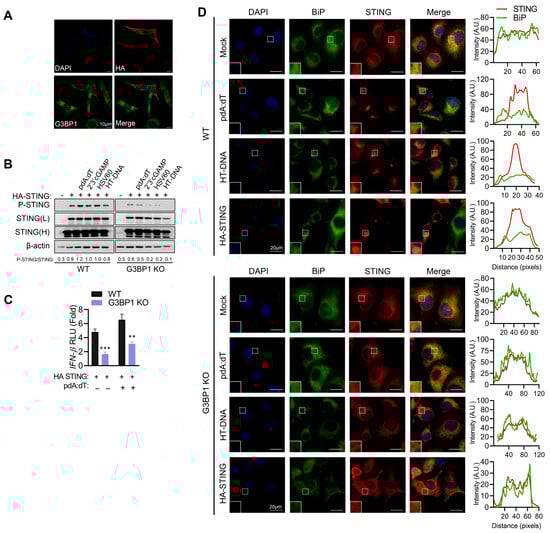 Multiple cytosolic DNA sensors like cyclic GMP-AMP synthase (cGAS), interferon gamma-inducible 16 (IFI16), absent in melanoma 2 (AIM2), DEAD-Box Helicase 41 (DDX41), and Z-DNA-binding protein (ZBP1) are expressed in a cell-type and context-specific manner to detect dsDNA [5,6,7,8]. Based on the literature, cGAS is the primary sensor, and upon binding endogenous or exogenous dsDNA, it synthesizes a second messenger molecule 2′-3′-cyclic GMP-AMP (cGAMP), which binds to stimulator of IFN genes (STING) on endoplasmic reticulum (ER) and triggers downstream signaling to produce type I interferons (IFNs) and proinflammatory cytokines to activate immune response [10,12]. To determine the DNA sensors that relay this signal in HT1080 cells, we used siRNA to knockdown cGAS, DDX41, or IFI16 expression and determined activation of STING and TBK1 by phosphorylation on immunoblots (Figure 3A). Cells with cGAS KD (knockdown) showed reduced phosphorylation of STING and TBK1 with pdA:dT and HT-DNA. Based on these results, in this study, we focused on comparing signaling events mediated by STING in response to pdA:dT and HT-DNA using CRISPR/Cas9 STING KO cells. Additionally, overexpression of STING activates and induces IFNβ production and signaling pathway [3]. We compared the activation of signaling pathways leading to IFNβ production in WT, WT cells expressing HA-STING and STING KO activated with the DNA ligands and cyclic dinucleotides (Figure 3B,C). To rule out the role of RNA sensors, we analyzed the signaling pathway activated by HT-DNA in WT, STING KO, and RIG-I KO cells (Figure 3C). As demonstrated in the literature, compared to WT cells, HA-STING expression resulted in enhanced ligand-induced phosphorylation of STING and TBK1 that is required for transcriptional induction of IFNβ. Secreted IFNβ via IFNAR receptor activates JAK-STAT1 signaling pathway and we observed p-STAT1 in response to DNA ligands. Consistent with our previous observation, phosphorylation of eIF2α, indicative of activation of integrated stress response, was seen in ligand-treated samples and in HA-STING lysates. Cells lacking STING showed dampened activation of IFNβ signaling and p-eIF2α, demonstrating an integral role of STING in mediating ligand-activated stress response. We then compared SG formation by pdA:dT and HT-DNA in WT and STING KO cells. As expected for cells defective in p-eIF2α, fewer SG positive cells were observed in STING KO cells compared to WT cells (Figure 3D). We further used CRISPR/Cas9 KO G3BP1 KO cells and stained for another SG marker, TIA1 in cells transfected with pdA:dT. WT cells showed G3BP1 and TIA1 localizing to SG, and in cells lacking G3BP1, we confirmed that SGs, were not formed as no TIA1 positive puncta were observed (Figure 3E). Our results demonstrate the role of cGAS as a DNA sensor signaling through ER-resident protein STING to activate stress response pathway and IFNβ production to promote SG formation and trigger IFNβ signaling cascade.