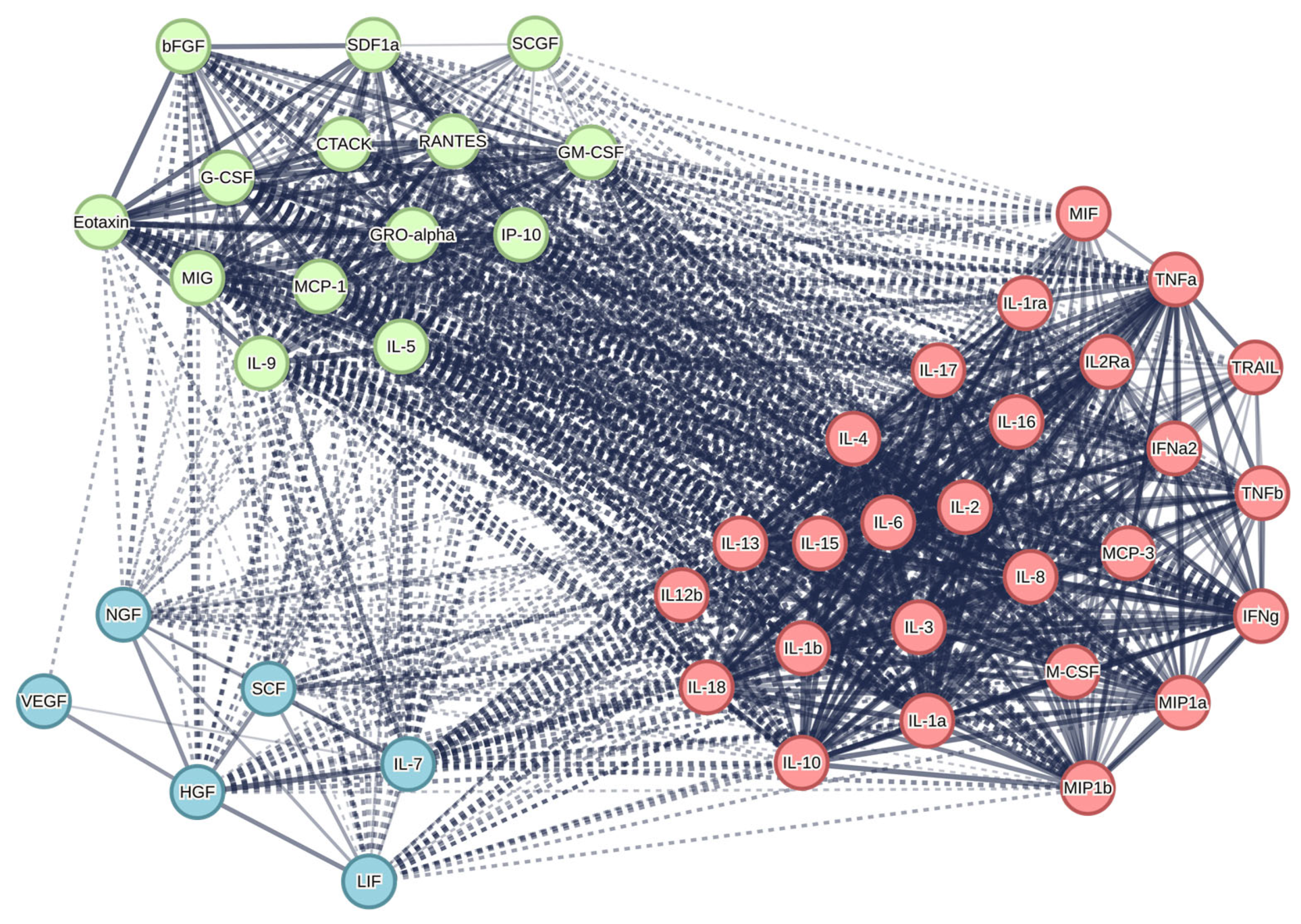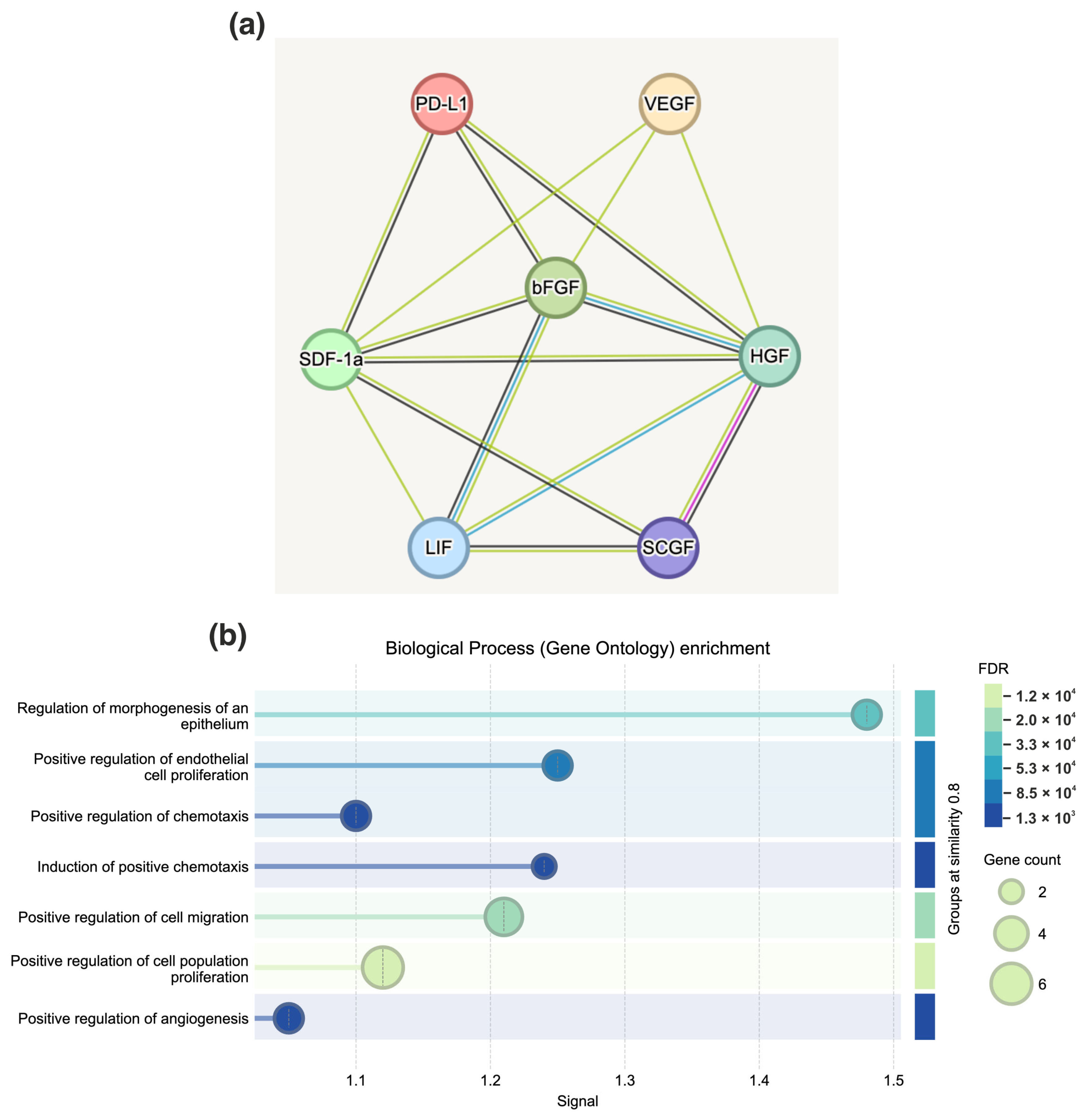 3.4. Protein–Protein Interaction Network of Cytokines and Growth Factors via Search Tool for the Retrieval of Interacting Genes/Proteins of Database