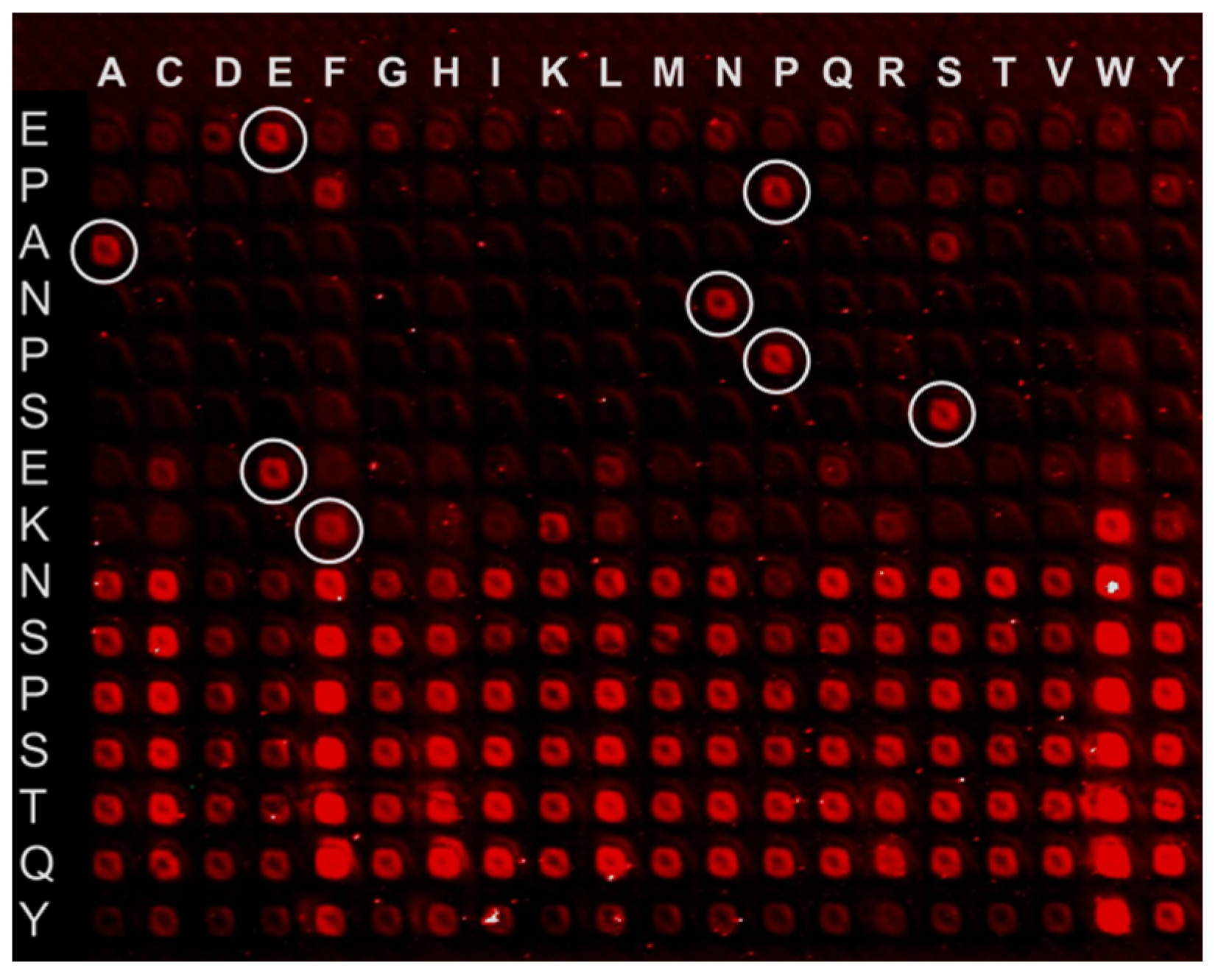 - Li, S.S.; Wu, C. Using peptide array to identify binding motifs and interaction networks for modular domains. Methods Mol. Biol. 2009, 570, 67–76. [Google Scholar] [CrossRef]