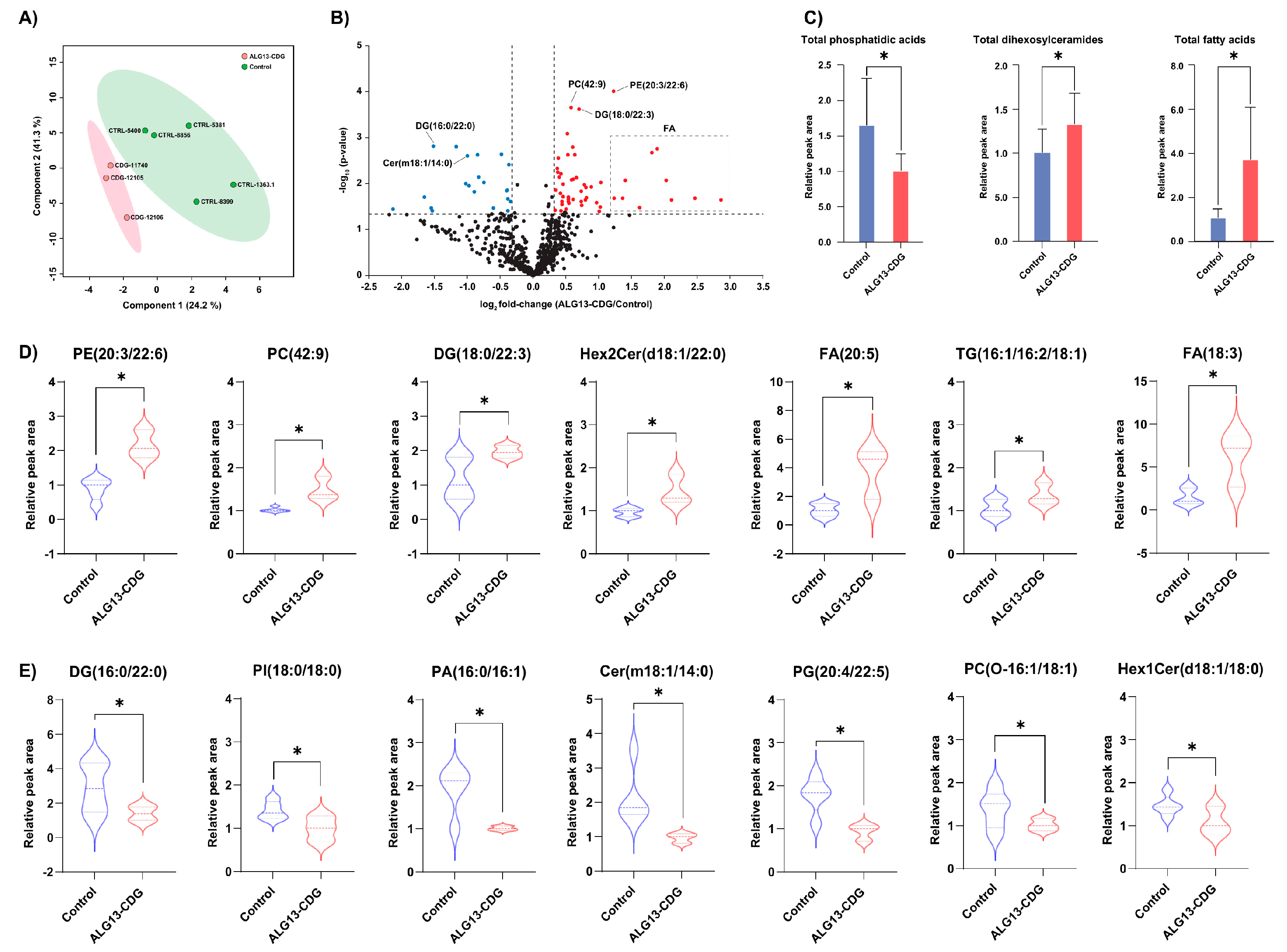 3.8. Lipidomic Profiling Identifies Broad Alterations in Phospholipid Composition in ALG13-CDG hCOs