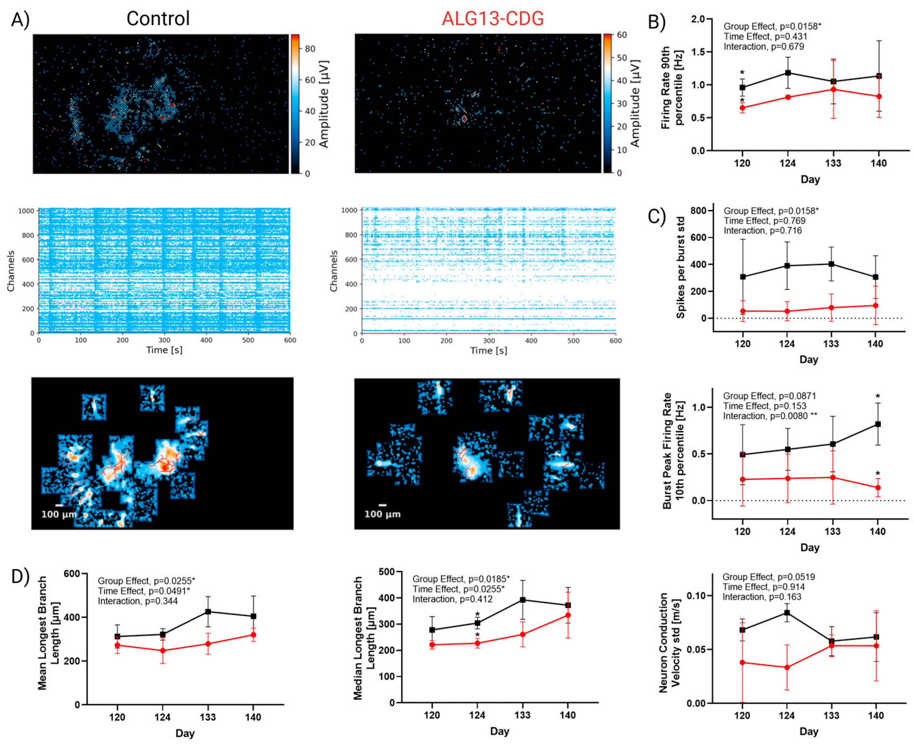 3.9. ALG13-CDG Cortical Organoids Exhibit Reduced Activity and Impaired Neuronal Network Maturation and Activity