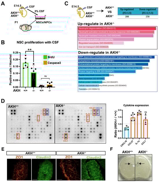 Taken together, these findings suggest that AKH deficiency leads to Claudin-2 upregulation in the ChP, thereby compromising the integrity of the blood–CSF barrier (BCSFB) and allowing pro-inflammatory cytokines such as IL-1α to enter the CSF, where they may suppress NSCs proliferation.