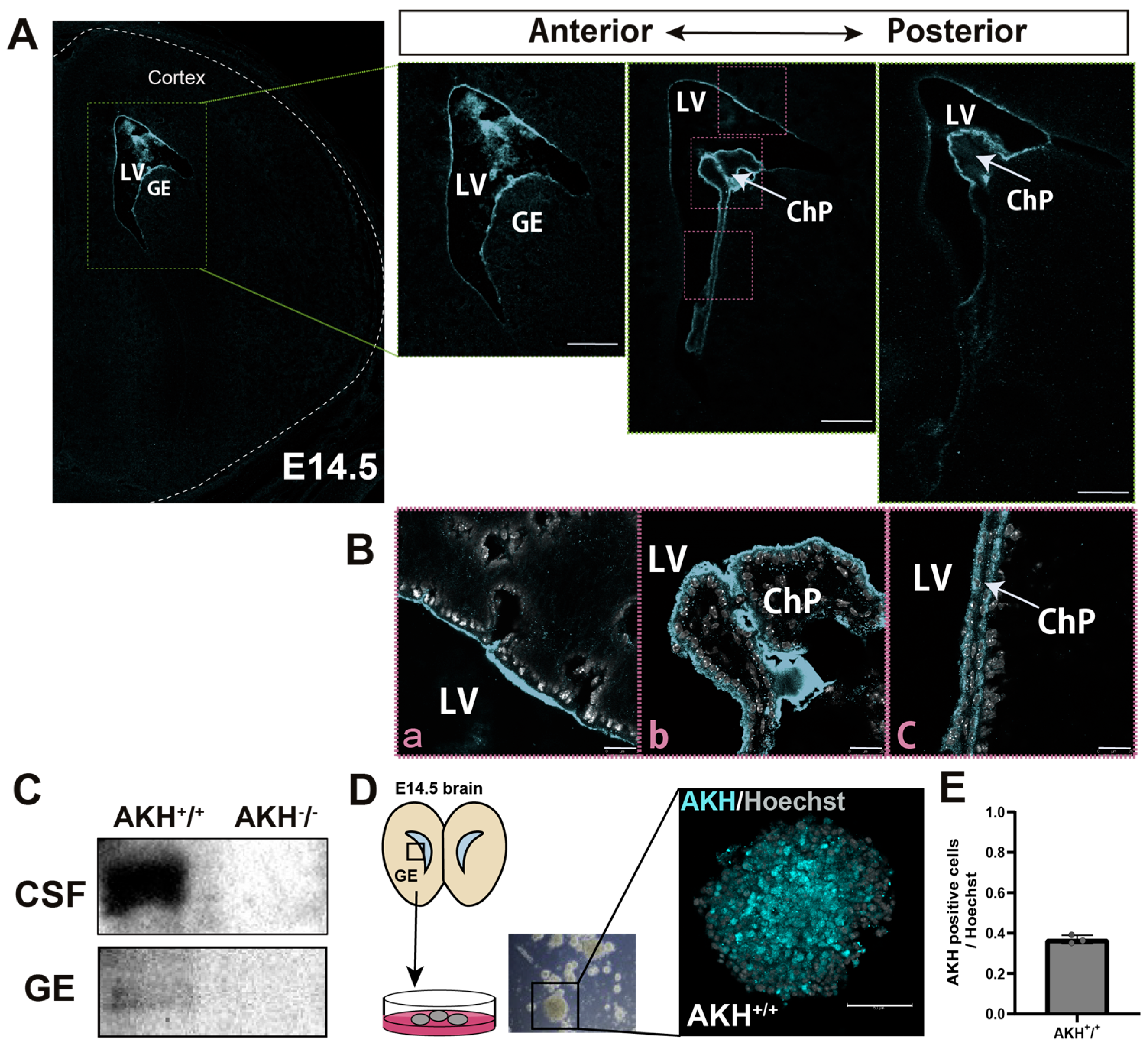 Because AKH is abundantly expressed along the apical surface of ChP epithelial cells, we predicted that AKH is secreted into the CSF upon synthesis, with a fraction remaining associated with the apical surface of ventricular NSCs/NPCs layers. This model is supported by two observations: (i) AKH immunostaining appears patchy rather than uniform along the apical NSCs/NPCs surface [
