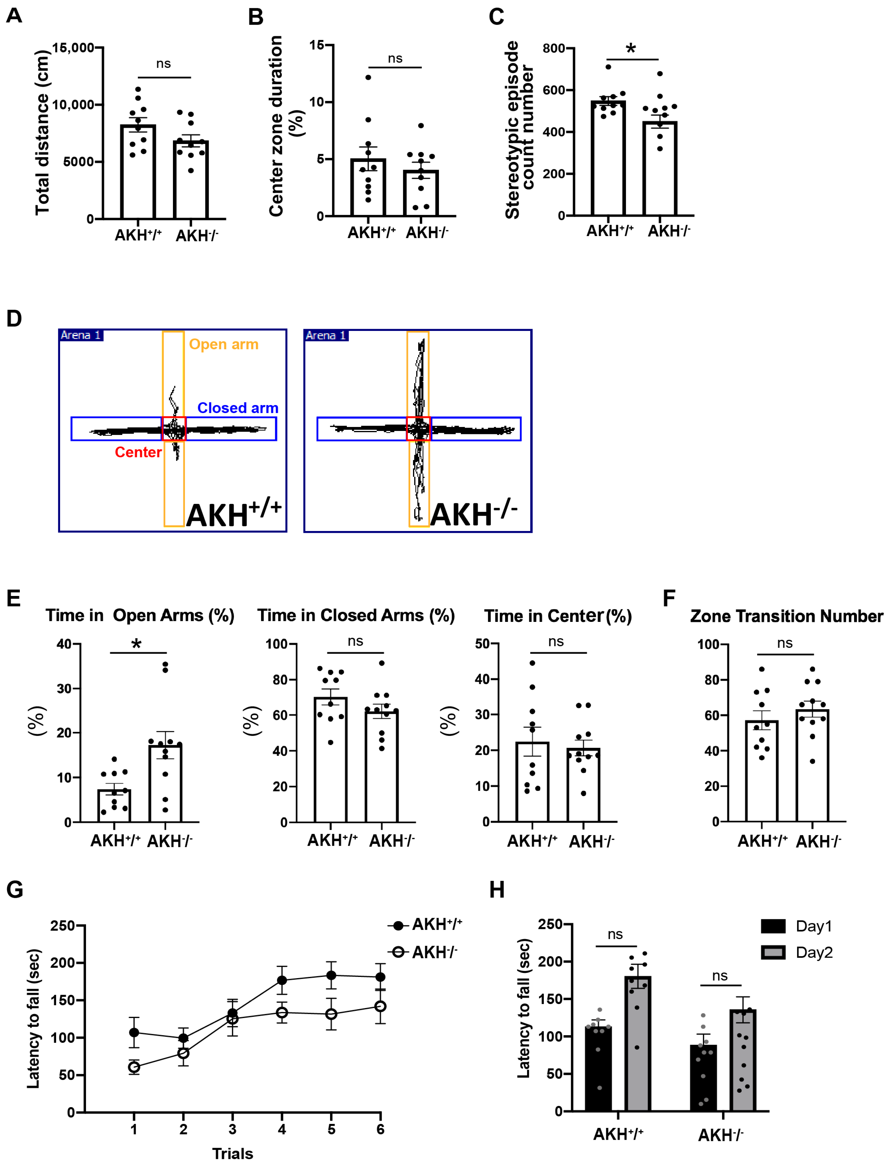 Figure 5A,B). The number of stereotypic episodes in the open-field test was significantly reduced in AKH
