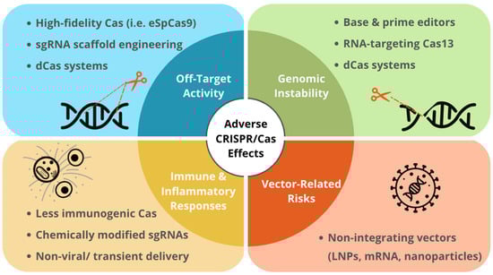 The major long-term adverse effects associated with CRISPR/Cas therapies and corresponding molecular modifications to address these challenges are summarized in Figure 1 [14,23,97].