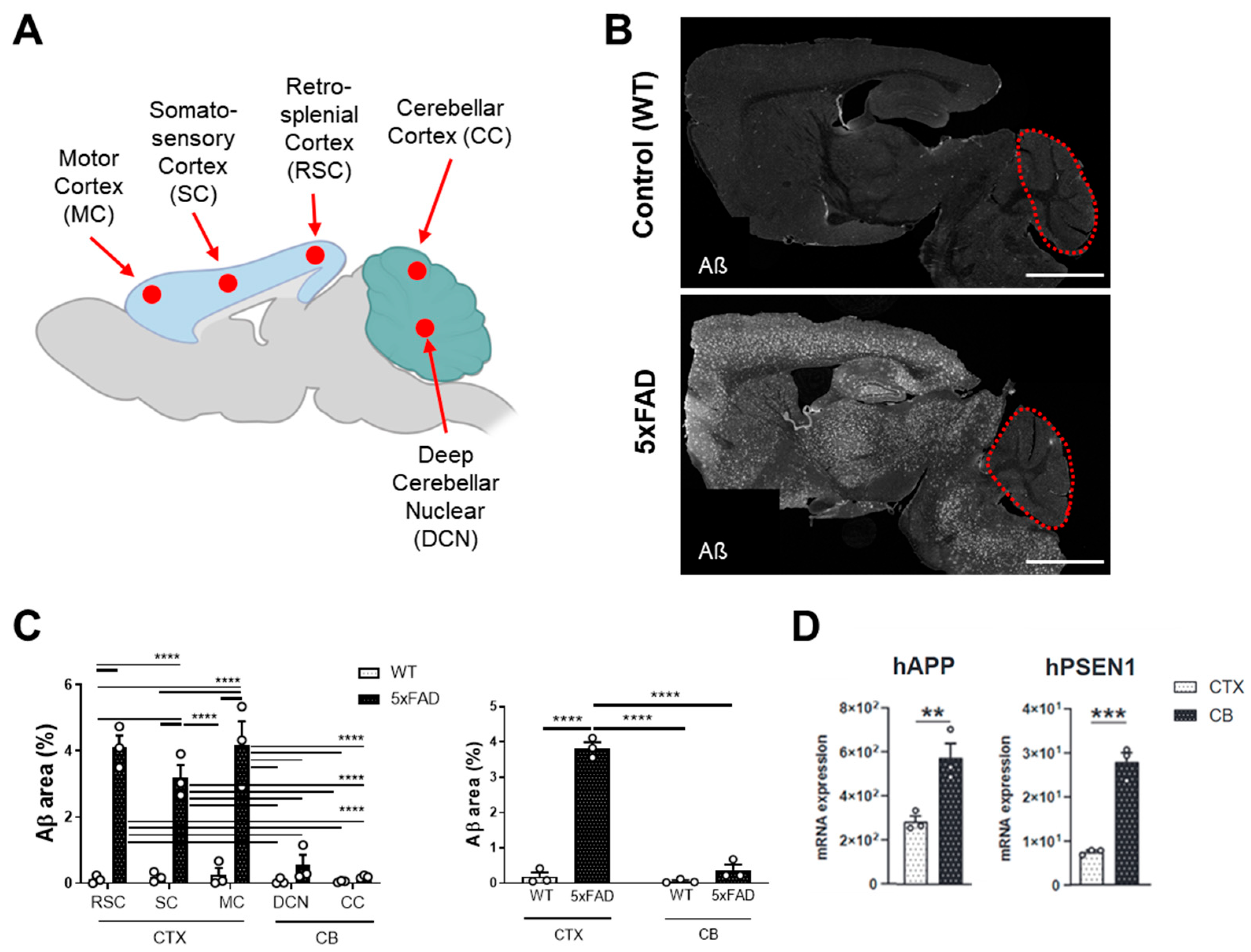 3.1. Differential Amyloid-Beta Accumulation in Cortical and Cerebellar Regions