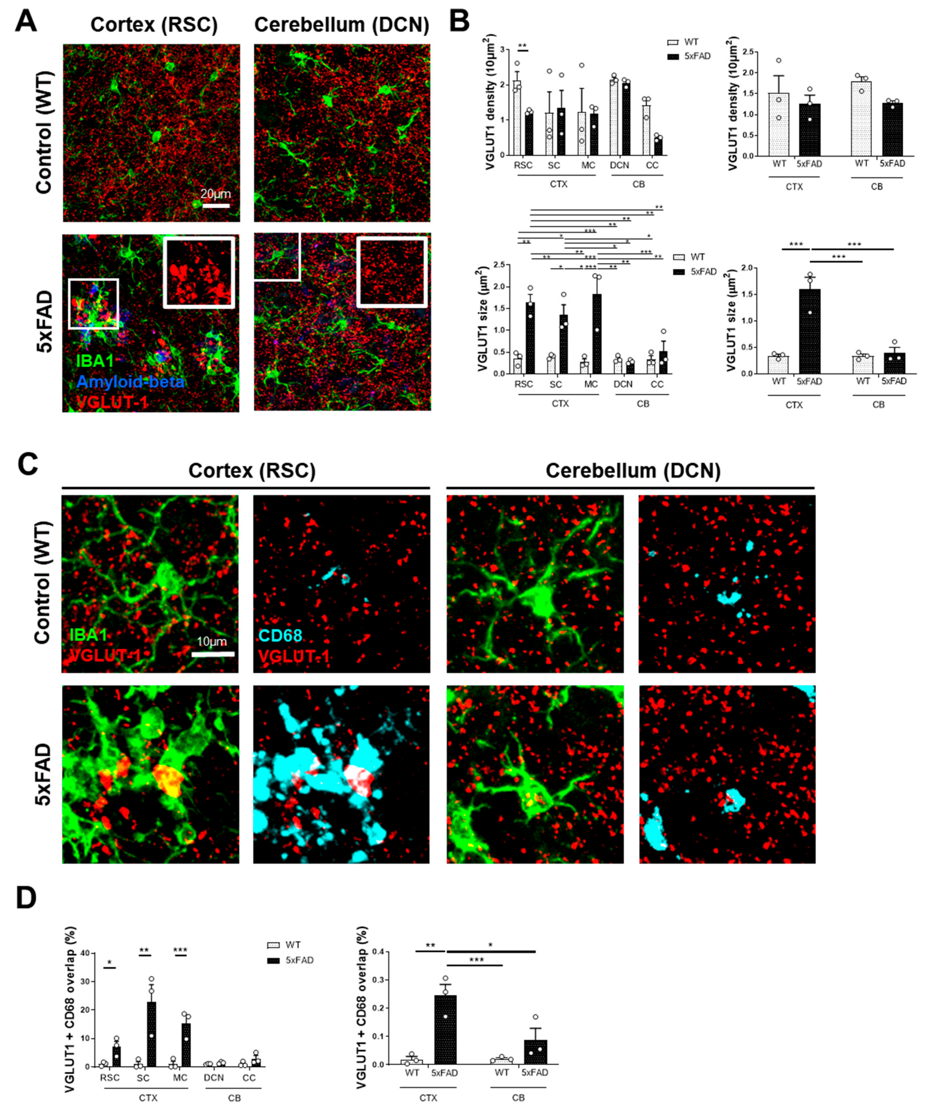 - Sokolow, S.; Luu, S.H.; Nandy, K.; Miller, C.A.; Vinters, H.V.; Poon, W.W.; Gylys, K.H. Preferential accumulation of amyloid-beta in presynaptic glutamatergic terminals (VGluT1 and VGluT2) in Alzheimer’s disease cortex. Neurobiol. Dis. 2012, 45, 381–387. [Google Scholar] [CrossRef] [PubMed]
