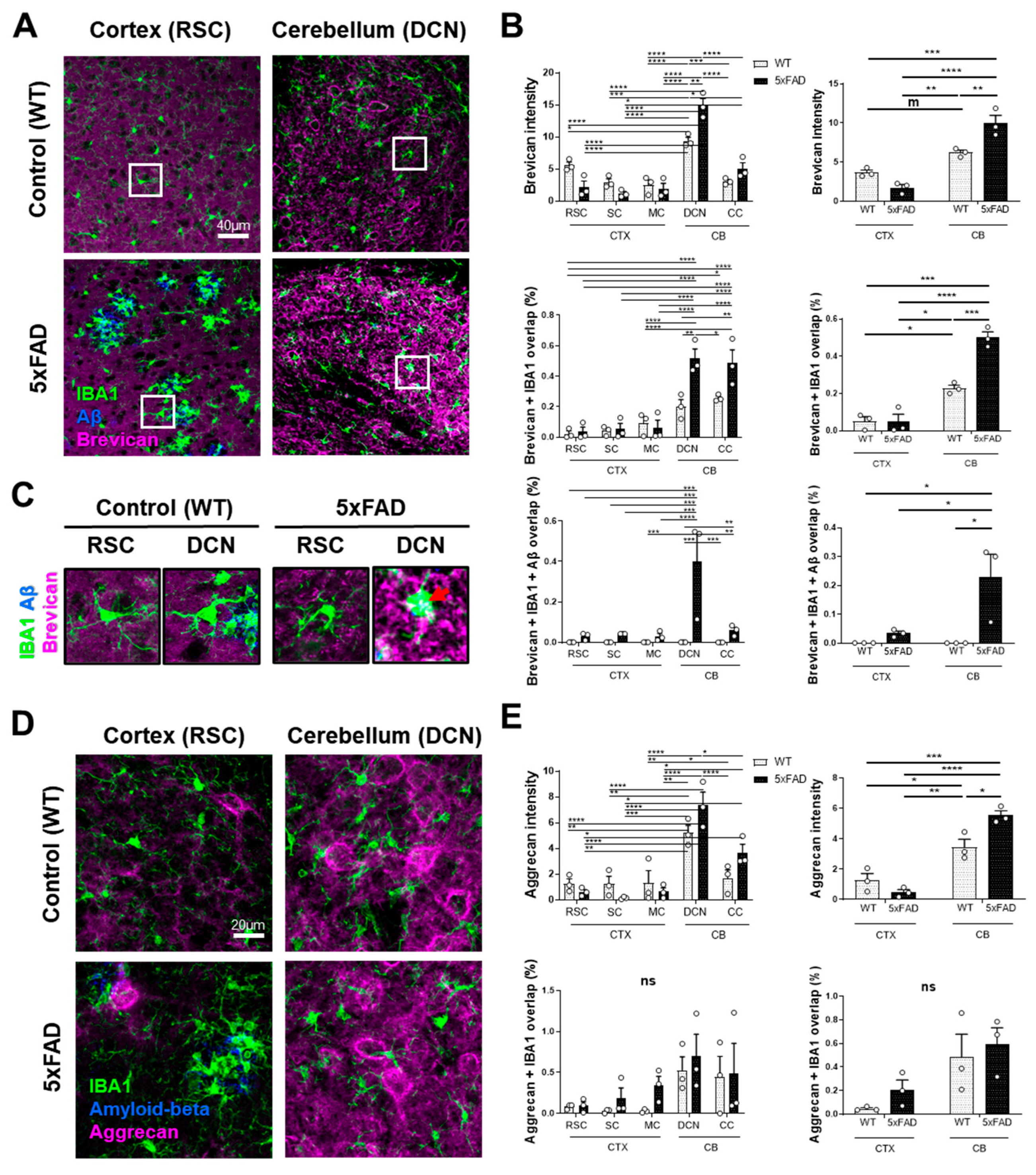 3.4. Extracellular Matrix Proteoglycan Clusters Facilitate Microglial Aβ Clearance in the Cerebellum