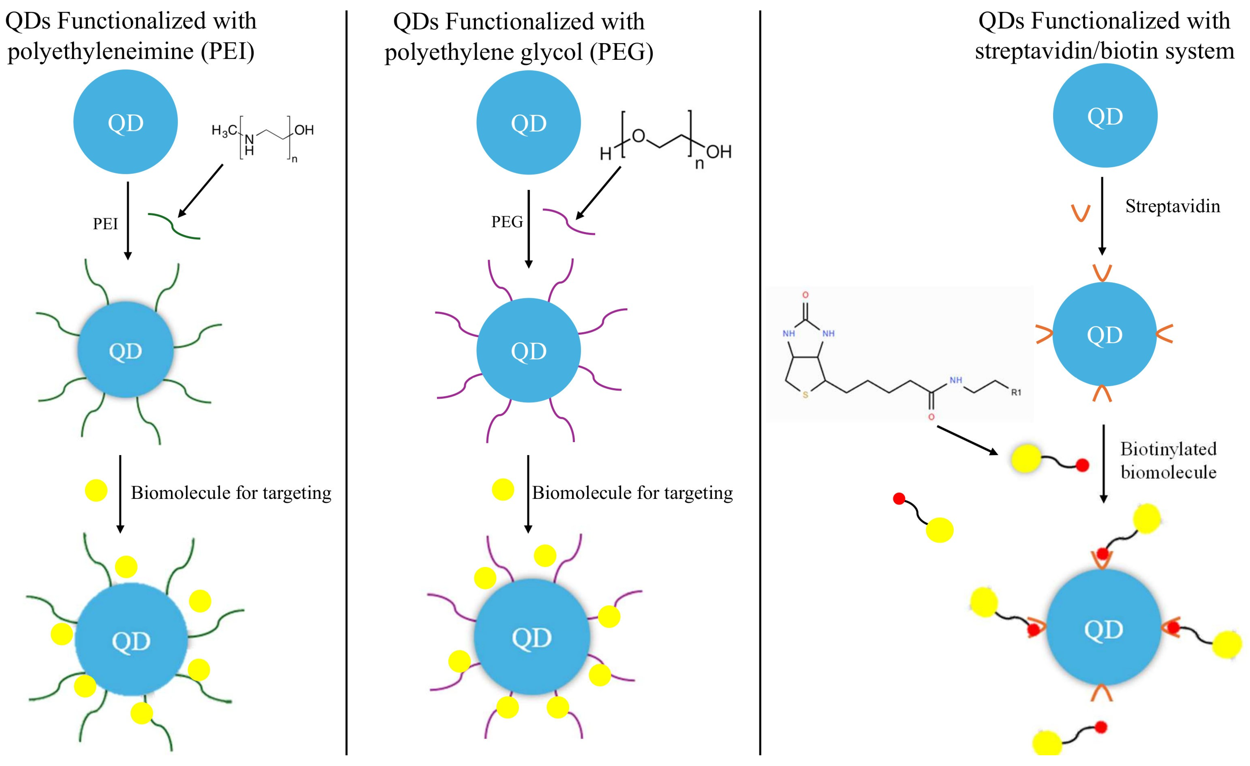 | PEG, azide, alkyne-bearing guangxitoxin-1E | CdSe/CdS core/shell QDs | Imaging of CHO-K1 cells in vitro | The QDs are first coated in PAOA and PMAO, which are amphiphilic copolymers. Then, PEG and azides were added to the surface of the coated QDs. Afterwards, the QDs with the azide functionality were conjugated with the alkyne-bearing guangxitoxin-1E, a potassium channel-specific toxin, in a cooper-catalyzed click reaction. The conjugated QDs showed high affinity for cells with high potassium channel expression. | [70] |