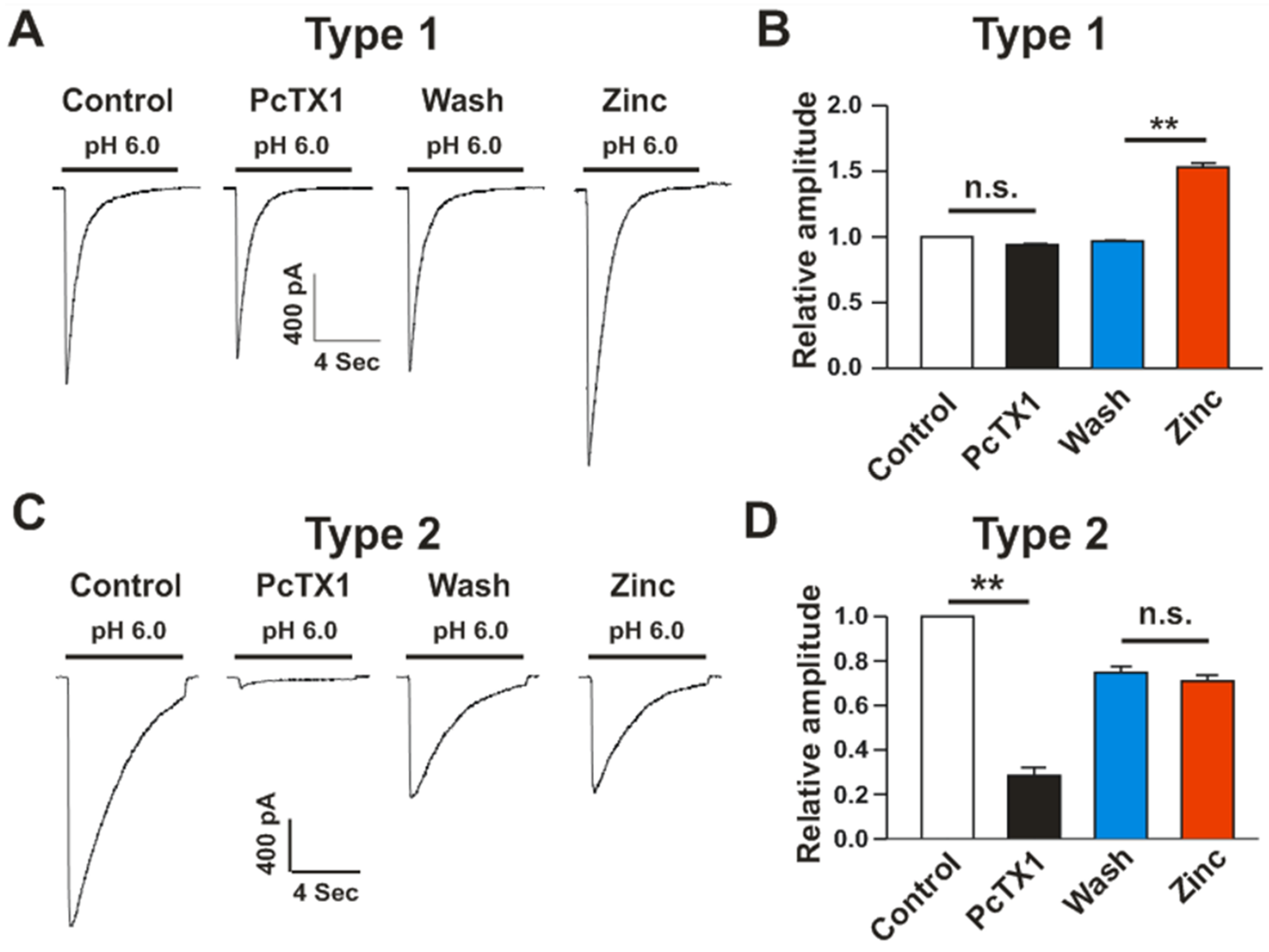 3.1. Zinc Administration Increases Acid-Induced Currents in PcTx1-Insensitive Neurons