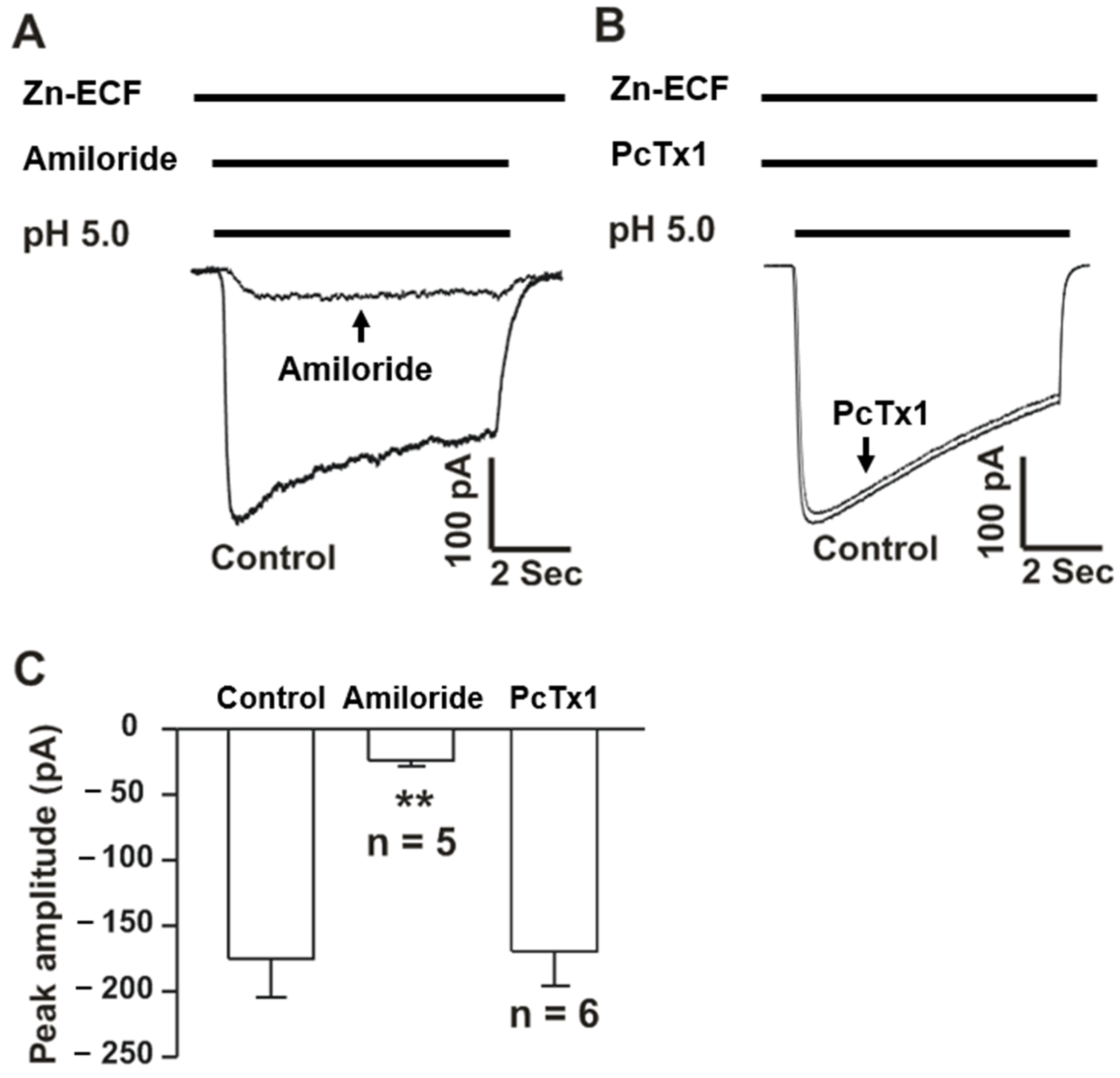 3.2. Acid Activates Zinc-Mediated Currents Which Are Inhibited by Amiloride