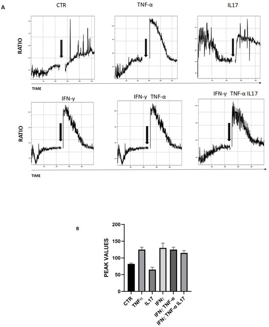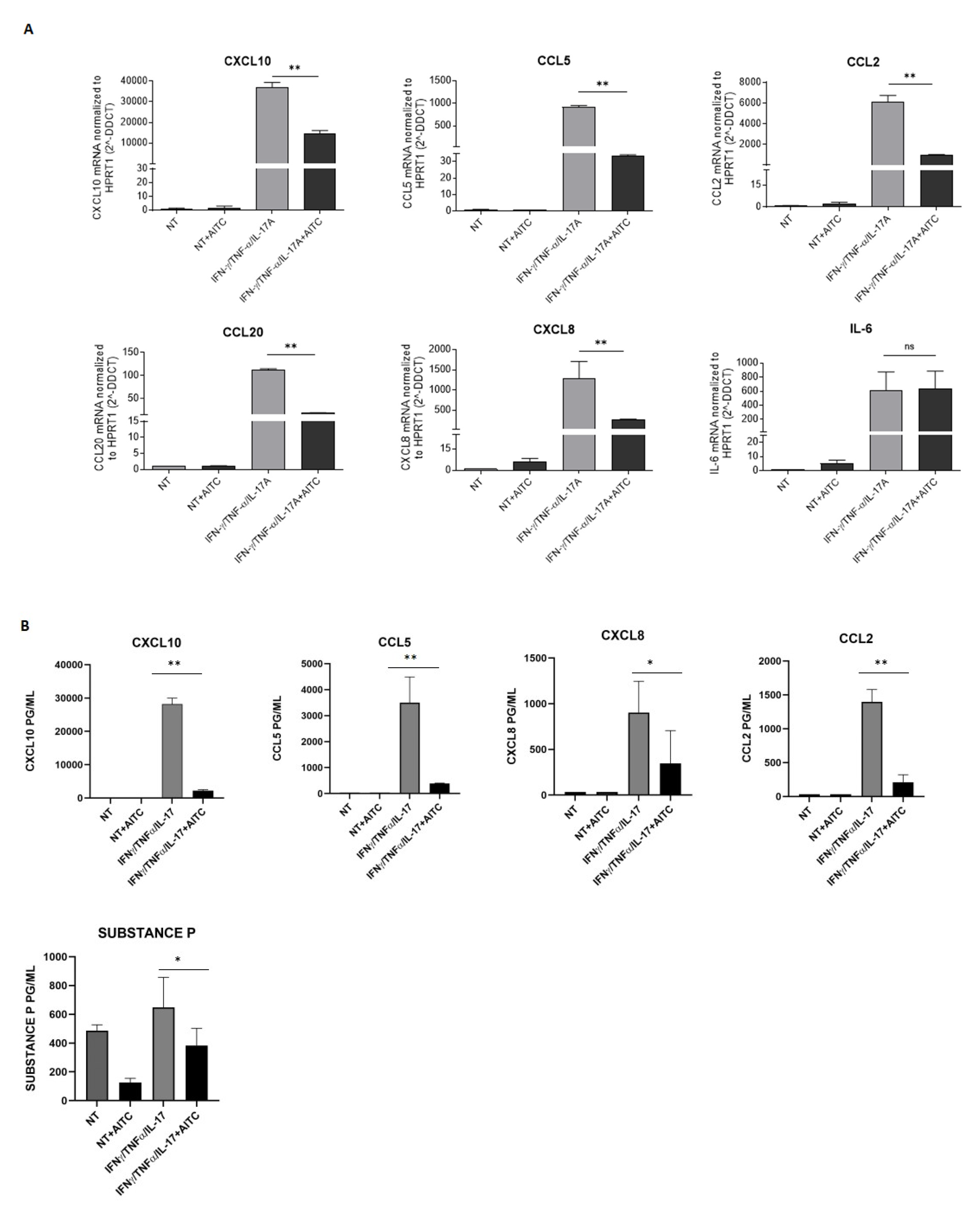 TRPA1 is closely linked to pain because it is a receptor that responds to various noxious stimuli, including irritants, toxins, and environmental factors, which can influence inflammatory responses. For this reason, we aimed to evaluate the expression of substance P in keratinocytes. Keratinocytes were treated with AITC, in the presence or absence of a mixture composed of IFN/IL17/TNF, for 18 h. The results show differences between controls and treated samples: in particular, in the presence of AITC, cells can secrete a reduced amount of Substance P (Figure 4B). Moreover, keratinocytes do not produce CGRP under any of the experimental conditions.