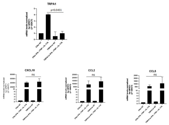To assess whether the modulation of chemokines is selectively linked to TRPA1, gene-silencing experiments were performed. As shown in Figure 5, transfection led to a reduction in TRPA1 expression, which was particularly evident in the presence of cytokines. Silenced cells displayed a slight increase in CXCL10, CCL2, and CCL5 expression, although this change did not reach statistical significance.
