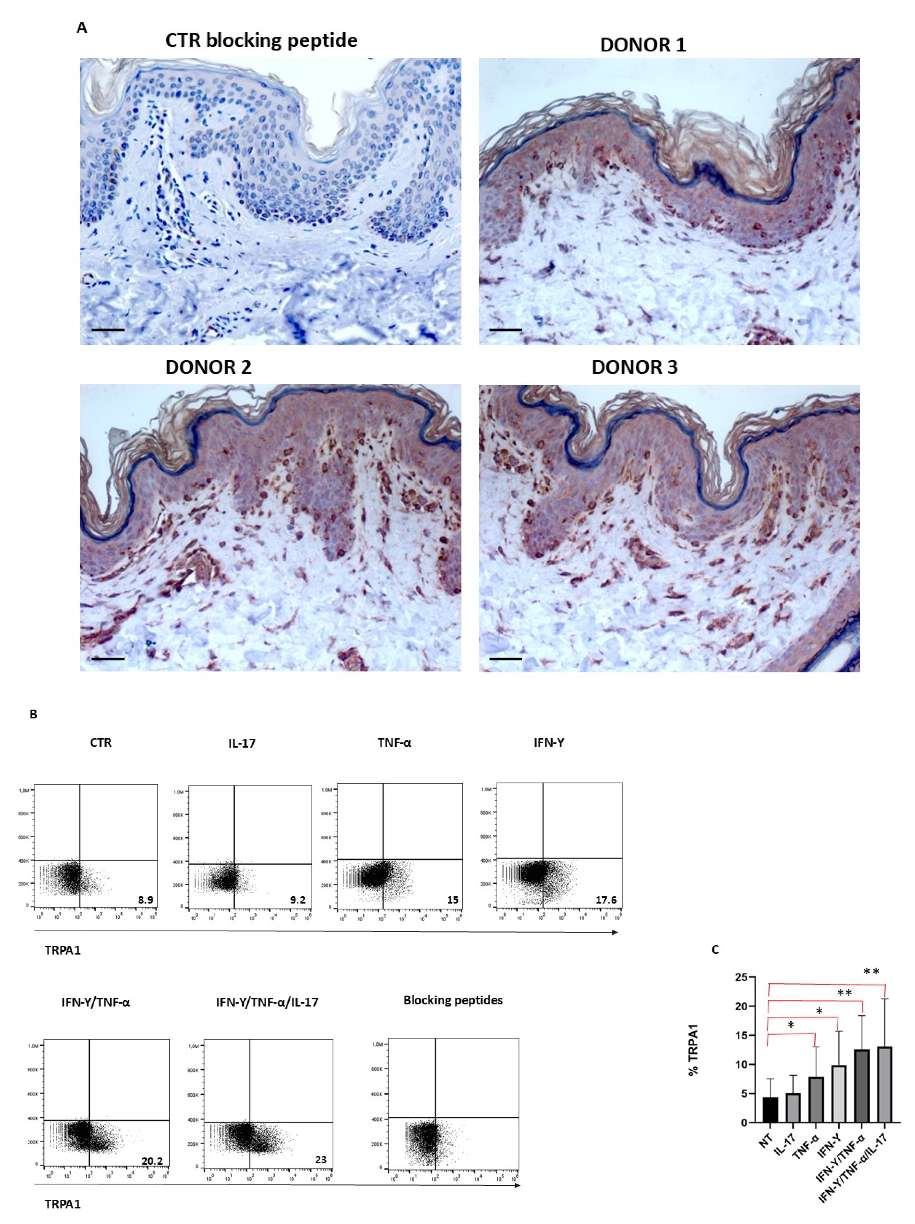 To understand whether TRPA1 expression in keratinocytes is modulated by inflammatory stimuli, cells were cultured in the presence or absence of different inflammatory stimuli and then analyzed by cytofluorimetry. TRPA1 was expressed only by a small percentage of keratinocytes; this percentage increased when cells were treated with IFN-γ and TNF-α, while IL-17 appeared to have no effect on TRPA1 expression. When administered together, TNF-α and IFN-γ had a synergistic effect, significantly increasing TRPA1 expression (Figure 1B,C). Antibody specificity in TRPA1-positive samples was validated through the use of a blocking peptide, demonstrating that the observed immunohistochemical signal was specific.