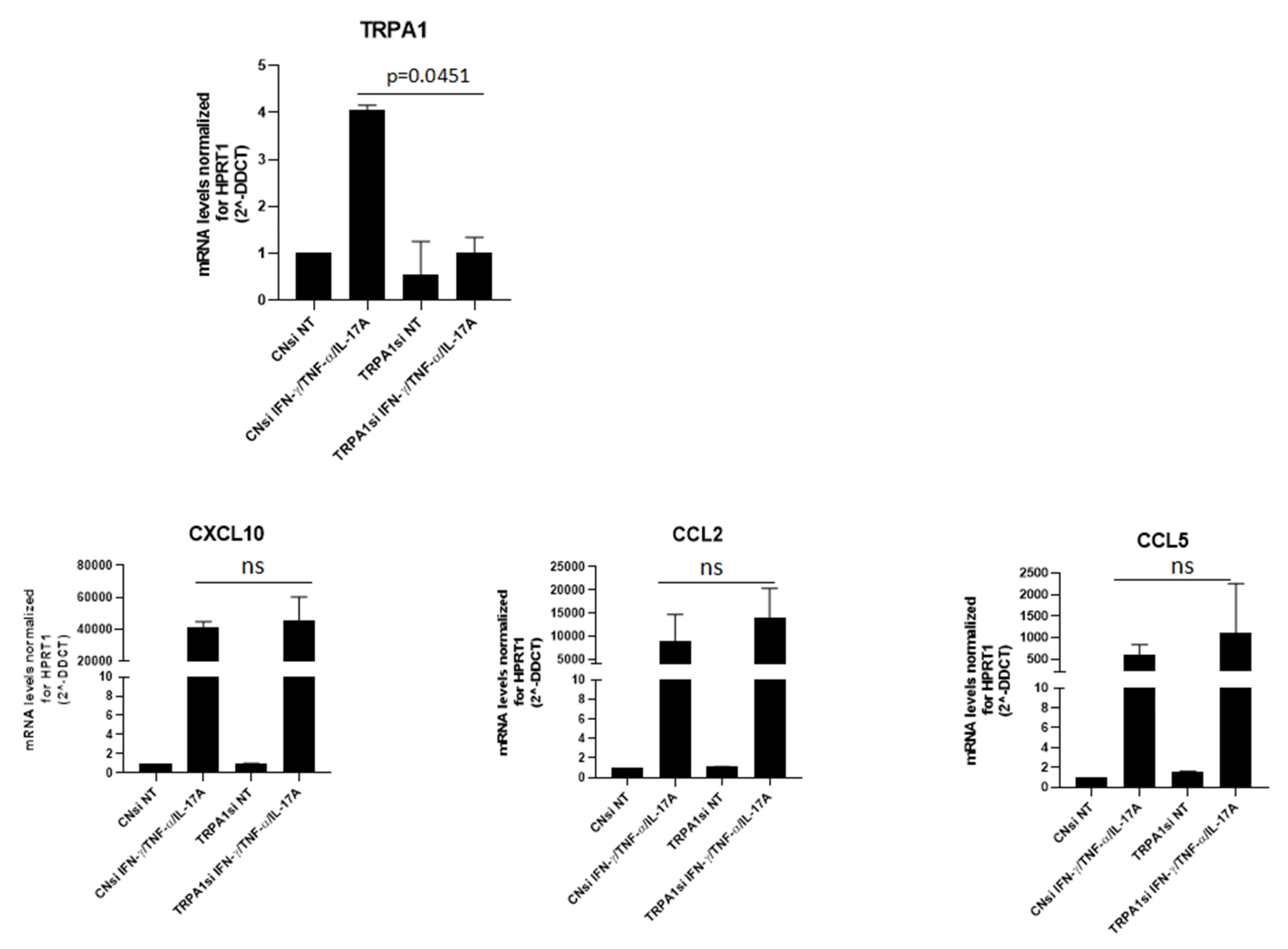 TRPA1 knockdown resulted in a modest upward trend in the expression of all three chemokines; however, these changes did not reach statistical significance. The limited magnitude of the effect is likely related to the complexity of the silencing approach in this experimental system. TRPA1 is poorly expressed in keratinocytes under basal conditions and is strongly induced only upon stimulation with pro-inflammatory cytokines. Under these conditions, achieving complete TRPA1 silencing is technically challenging, and residual receptor expression is expected to persist, potentially dampening the functional impact of knockdown. The observed trend toward a slight increase in chemokine expression may reflect compensatory or redundant regulatory mechanisms within the inflammatory signaling network of keratinocytes. Importantly, our findings are consistent with recent published data [30], which also report no robust effects of TRPA1 modulation on chemokine expression.