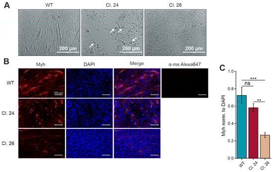 We previously reported the impaired differentiation and myotube formation in C2C12 Gne knockout (GneKO) clones compared to wild-type (WT) cells [11]. Addition of 10 nm insulin into the differentiation medium and coating of plates with 0.1% gelatine helped to restore myoblast fusion and differentiation to some extent (Figure 1). Nevertheless, immunofluorescence staining revealed that myosin heavy chain (Myh) expression was reduced and showed abnormal localization in the form of accumulation in GneKO clones (Figure 1B,C). Especially clone #24 showed characteristic alterations in cell morphology by forming extremely large myotubes and cell debris-like deposits (Figure 1A, white arrows).