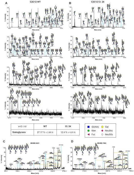 Sialylation has been previously shown to play a crucial role during muscle cell differentiation along with dynamic remodeling of sialoglycans [9,10,13,16]. However, it has not been investigated whether blockage of the endogenous sialic acid biosynthesis pathway by Gne depletion has other effects on N-glycan structures besides altering levels of sialic acids. Therefore, N-glycan analysis of C2C12 wild-type and GneKO clone #24 myoblasts was performed. Figure 2 shows that terminal sialic acids were mainly replaced by additional galactose residues, resulting in an increase in the galactose-α-1,3-galactose (α-Gal) epitopes in GneKO clone #24. The overall sialoglycan content was decreased by about 46%. Generally, both cell lines contained high mannose glycans, some bisected glycans, and complex N-glycans (Figure 2A,B). Higher mass glycans also contained chains of repeating units of galactose and N-acetylglucosamine (polyLacNAc). MS/MS analysis of selected high-mass glycans validated branched LacNAc (I-branches) structures (Figure 2C,D). However, global remodeling of the N-glycan core structures was not observed.
