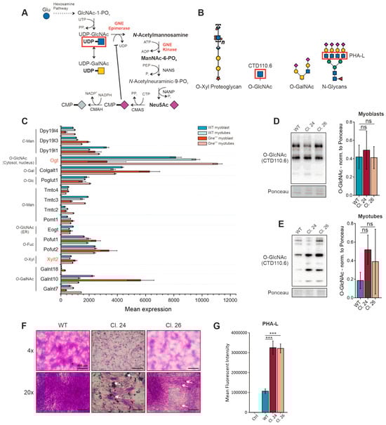 Analysis of glycosylation events in GneKO clones. (A) Endogenous sialic acid (N-acetylneuraminic acid) biosynthesis pathway. GNE catalyzes the epimerization of UDP-GlcNAc to ManNAc and its subsequent phosphorylation to ManNAc-6-PO4. (B) Common glycan structures that contain N-acetylglucosamine (GlcNAc). (C) Analysis of glycosylation-initiating gene expression in a Sol8 RNAseq data set [10]. (D) O-GlcNAcylation in C2C12 myoblasts. (E) O-GlcNAcylation in C2C12 myotubes. (F) Alcian blue/PAS staining of C2C12 myotubes. (G) N-glycan branching via PHA-L staining. GlcNAc: N-acetylglucosamine, GalNAc: N-acetylgalactosamine, PHA-L: phytohaemagglutinin-L, LacNAc: Galβ1-4GlcNAc, LacdiNAc: GalNAcβ1-4GlcNAc. Bar graphs show the mean of three independent experiments ± standard deviation. Asterisks indicate the p-value of the sample compared to the wild-type control. Statistical analysis: One-way ANOVA. ns = non-significant, *** p < 0.001.