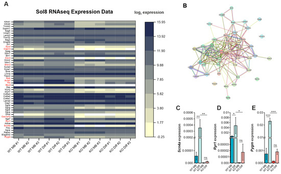 Next, we sought to investigate the functional effects of aberrant glycosylation in GneKO cells. As GNE myopathy solely affects skeletal muscle tissue, we wanted to focus on myopathy-related genes that have important functions in the maintenance of proper muscle physiology. The transcriptomic data set of the Sol8 GneKO cells served again as a starting point for the identification of candidate genes [10]. We selected a panel of genes that are known to cause congenital skeletal muscle disorders and looked for their expression in Sol8 GneKO cells compared to wild-type cells (Figure 4A). The heatmap shows the distinct transcriptomic landscape between wild-type myoblasts and myotubes as well as impaired expression of many genes in the GneKO clone. Using the STRING database for visualization, it became clear that most of the altered gene products form a tight network (Figure 4B). Among the most interesting candidates (highlighted in red) were the sodium channel protein type 4 subunit α (Scn4a), ryanodine receptor 1 (Ryr1), and glycogen phosphorylase muscle form (Pygm). These are known to play important roles in excitation-contraction coupling and energy metabolism, respectively. Diminished expression of these three genes was validated in Sol8 cells via qPCR (Figure 4C–E).