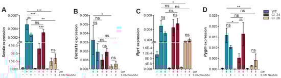We previously observed that exogenous N-acetylneuraminic acid (Neu5Ac) supplementation during the differentiation process had a positive effect on sialylation and myotube formation in C2C12 GneKO cells, while it negatively impacted wild-type differentiation [11]. Therefore, the next step was to evaluate the effects of Neu5Ac supplementation on gene expression to see whether impaired gene expression can be rescued by artificial sialylation of the cells. Noteworthy, excess Neu5Ac tended to negatively affect Scn4a, Cacna1s, Ryr1, and Pygm expression in wild-type myotubes. However, GneKO clone #24 showed a positive response to Neu5Ac, while the effects were less pronounced in clone #26 (Figure 5).